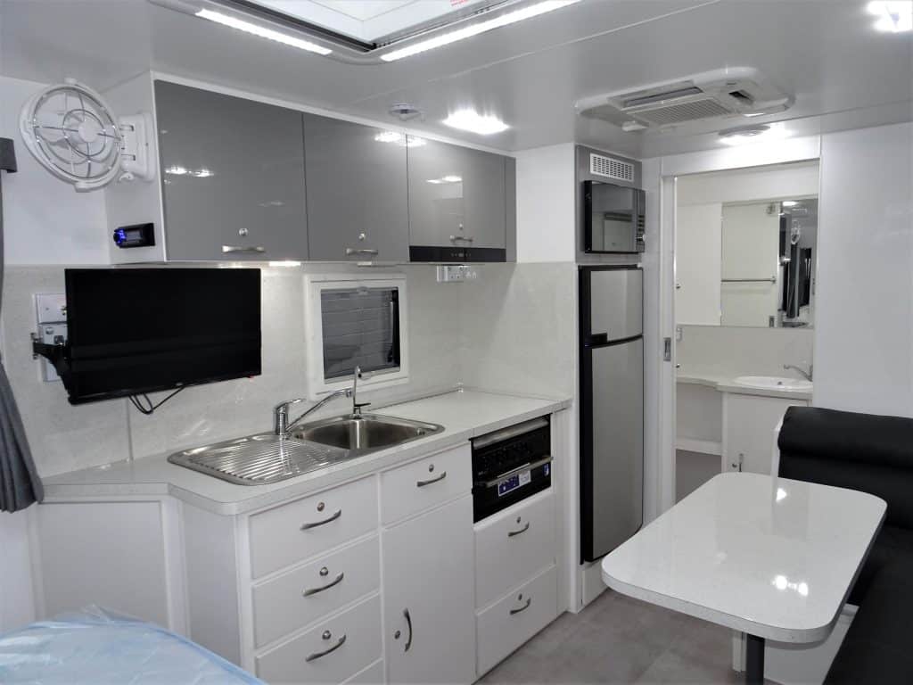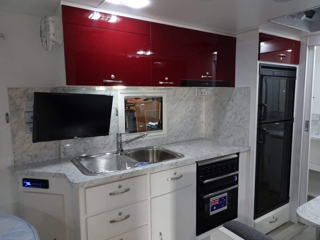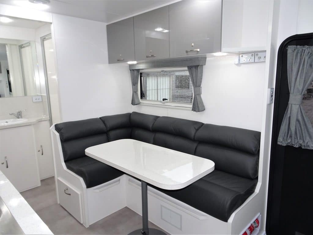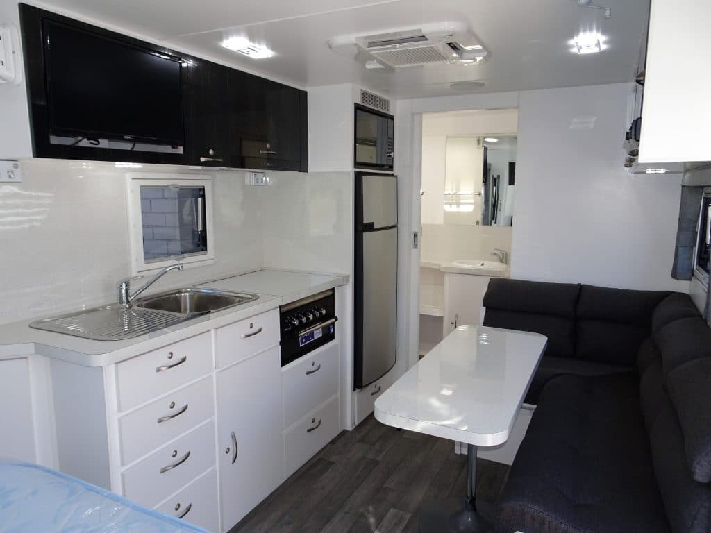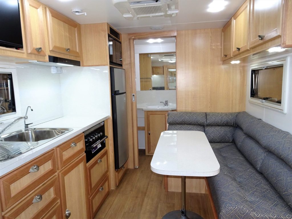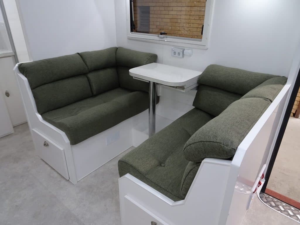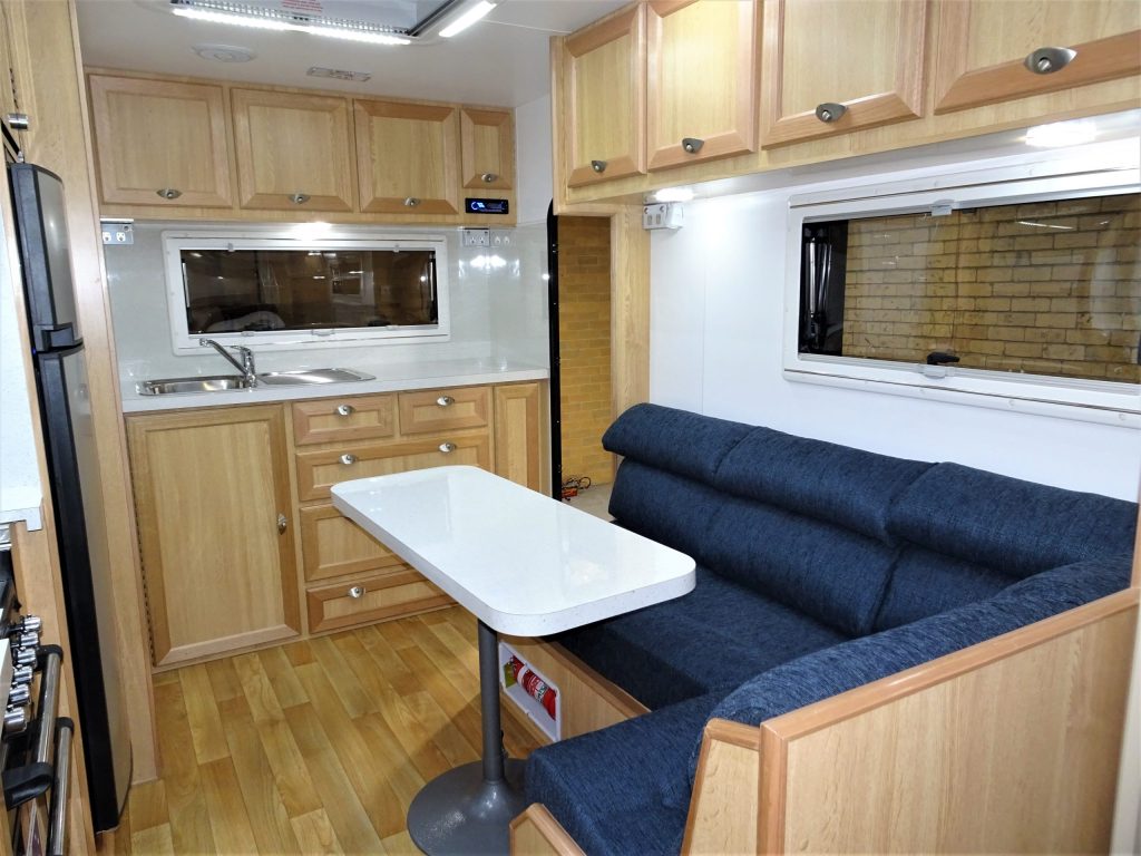The 17′ E900i incorporates an ensuiteand sits atop a chassis reinforced for 4WD towing and HD Independent Trailing Arm Independent Suspension. Fitted with 16″ Alloys, twin shock absorbers, Off-Road Coupling, Checker Plate front & side stone protection, hot dipped galvanised chassis, front stone guard, two jerry can holders & picnic table. Complete with the latest safety features – including rear vision camera & ESC. Fitted with Anderson Plug & heavy duty wiring. LED lighting throughout. Solar powered battery system included. Other inclusions – large Dometic 190l AES three way refrigerator, Ibis roof mounted air conditioner, Pioneer Radio/CD/MP3/USB & speakers, Microwave oven, Gas/Electric HWS & Dometic roll out awning. Ensuite features separate shower, toilet, & vanity unit. Front Queen size island bed with luxury innerspring mattress. Hi-Density foam upholstered cafe dinette seating. Tare 1,970kg. For further information, speak to the manufacturer directly, on 03 9459 7516.