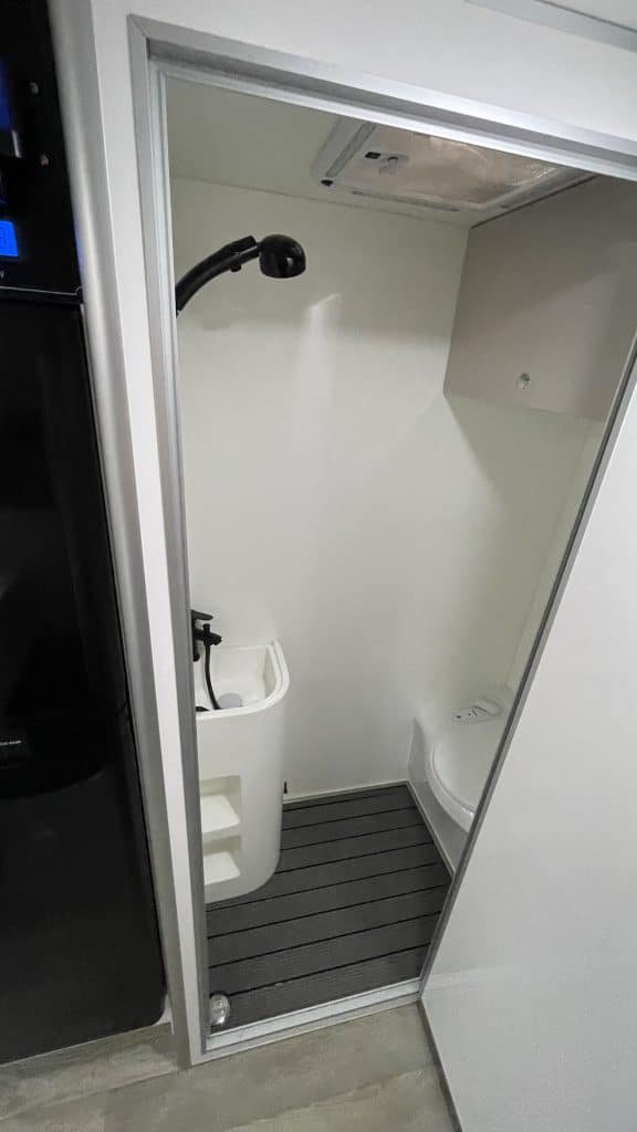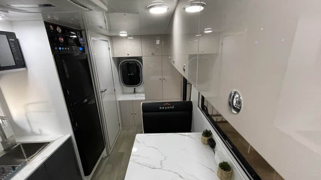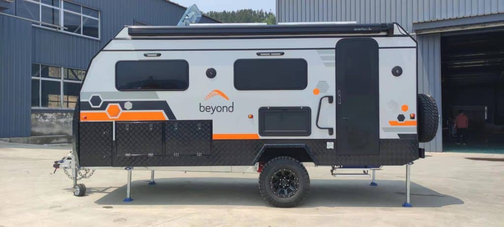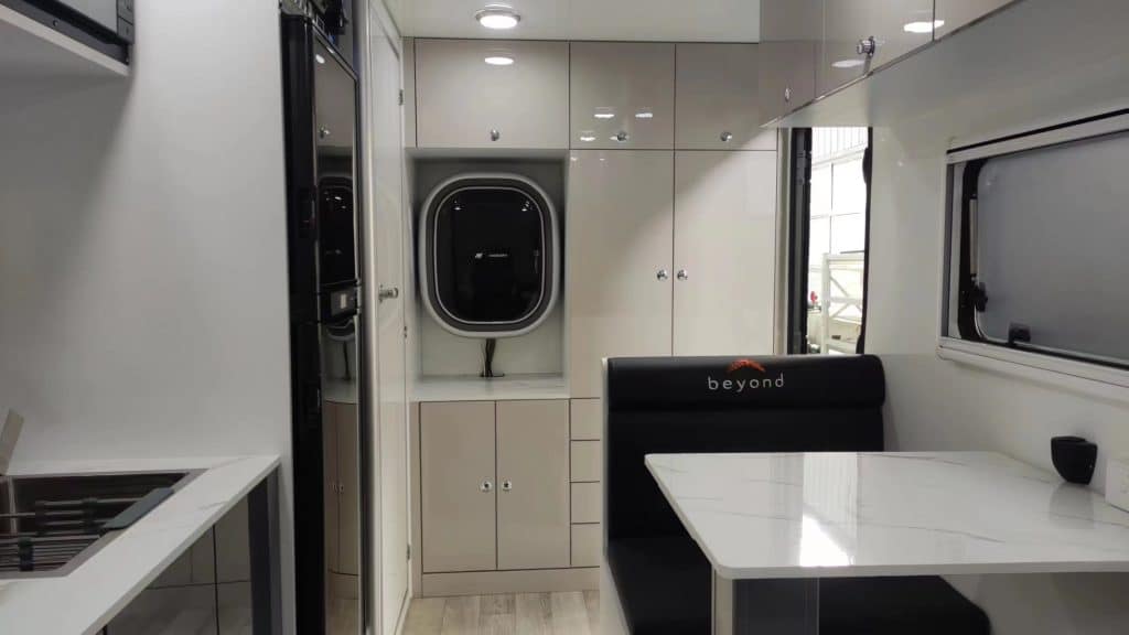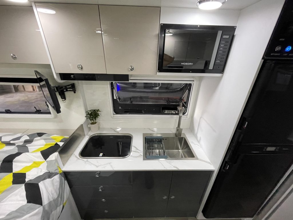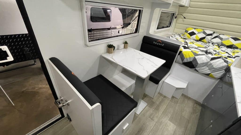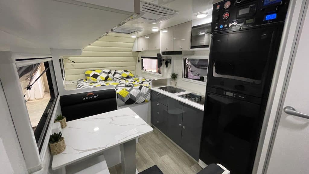 ON SPECIAL $3000 OFF RRP + 2KW Diesel Heater + 100aH Battery Upgrade!!! Our 17ft hard top model has a fixed queen bed with an quality innerspring mattress, an internal and external kitchen with an internal fridge and freezer and washing machine along with all the features of our other models Affordable luxury in a compact package to suit a couples every need. From a large twin door internal fridge, high gloss cabinetry, microwave oven, comfortable dinette with an adjustable table which converts to a small bed and reverse cycle air-conditioning provides you this rv has all the comforts of home. – Queen Size inner spring mattress – Dometic Air con – Internal Kitchenette + all appliances (microwave, fridge, sink, rangehood) – Wall hung 3KG Washing machine – Stainless steel outdoor kitchen – Leather plush couch seating