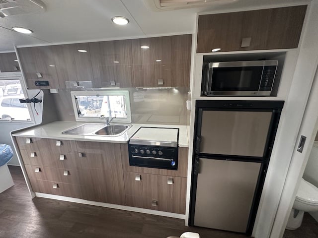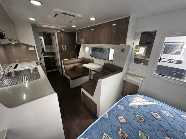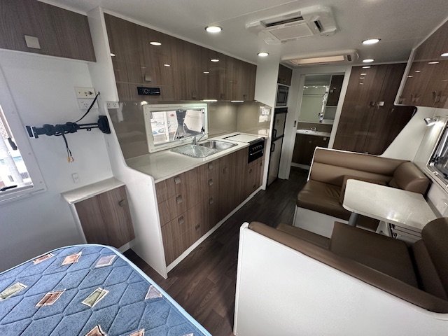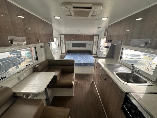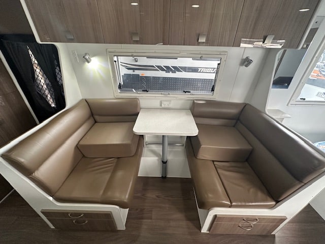 The center of the caravan hosts a café lounge with a tri-fold table. With a kitchen opposite that hosts a large two-door 3-way fridge, microwave, range hood, and 4-burner and mini grill.