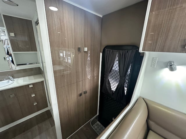 Standing at the entrance of the caravan you have a 4 door pantry, which can be extremely handy in providing quick access for outdoor cooking.