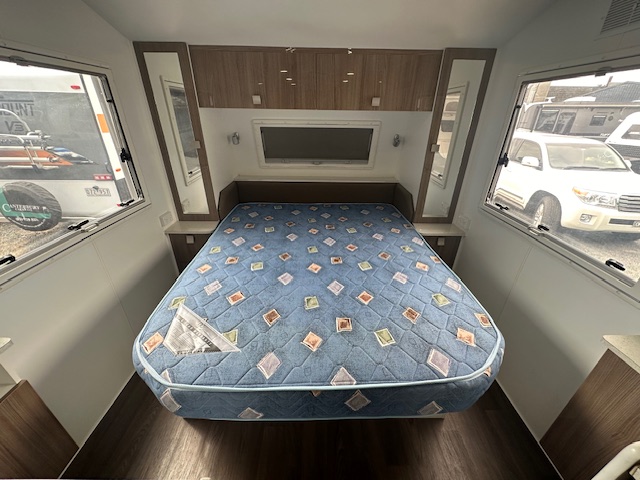 Walking through to the front of the caravan you have a queen lift-up bed with an innerspring mattress. Two robes on either side with overhead cupboards.