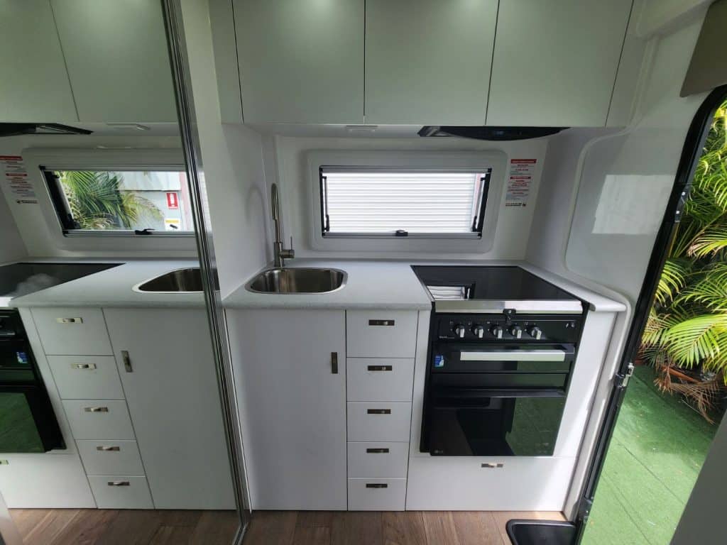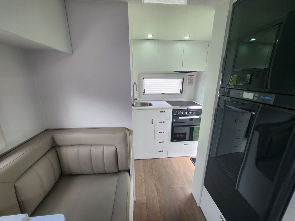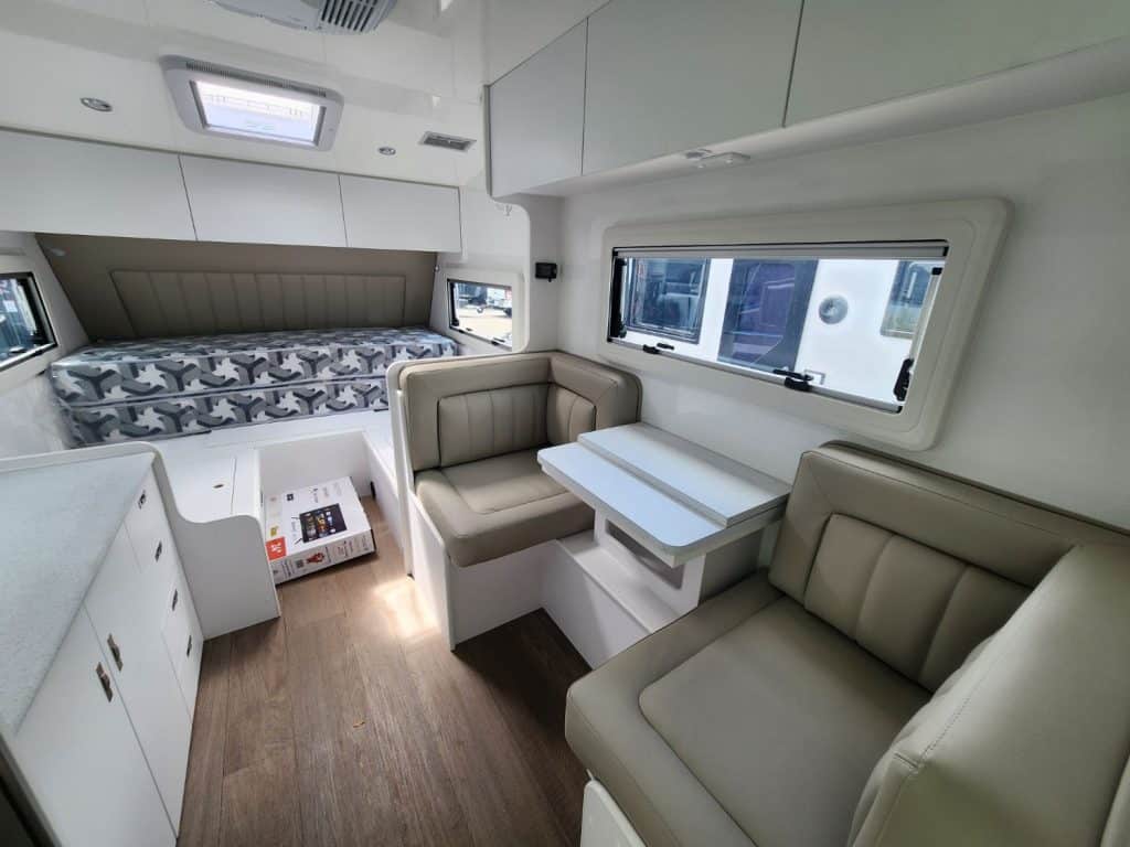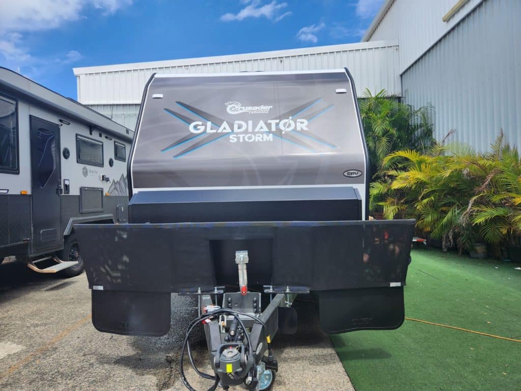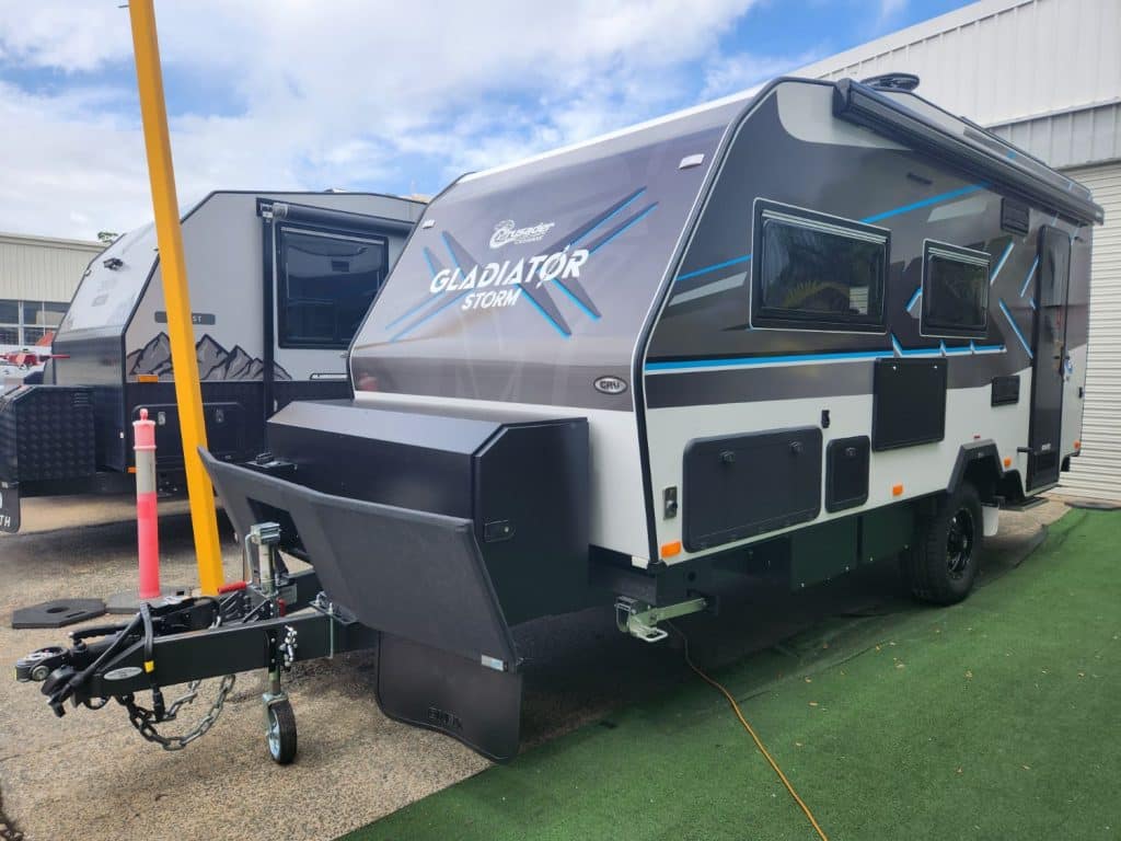 The Gladiator Storm is the ultimate caravan for off-road adventurers who value versatility and modern living. Designed with the global shift toward remote work in mind, it includes a dedicated office space with a functional desk, allowing you to stay productive no matter where the road takes you. For added flexibility, customers can customize this space to suit their needs, opting for additional storage, an extra dinette, or even pet-friendly features like a day bed and integrated bowls. With standard features such as café-style seating, a fully equipped kitchen, and a bathroom with a shower and toilet, the Gladiator Storm lets you seamlessly balance work and leisure during your off-road adventures.