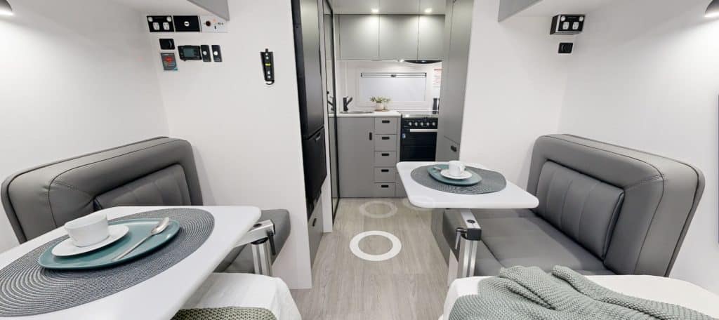 - Fully Equipped Kitchen: Prepare meals effortlessly with a gas/electric cooktop, microwave, and a spacious Thetford compressor fridge, all set within a modern design featuring soft-close drawers.