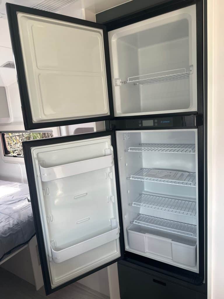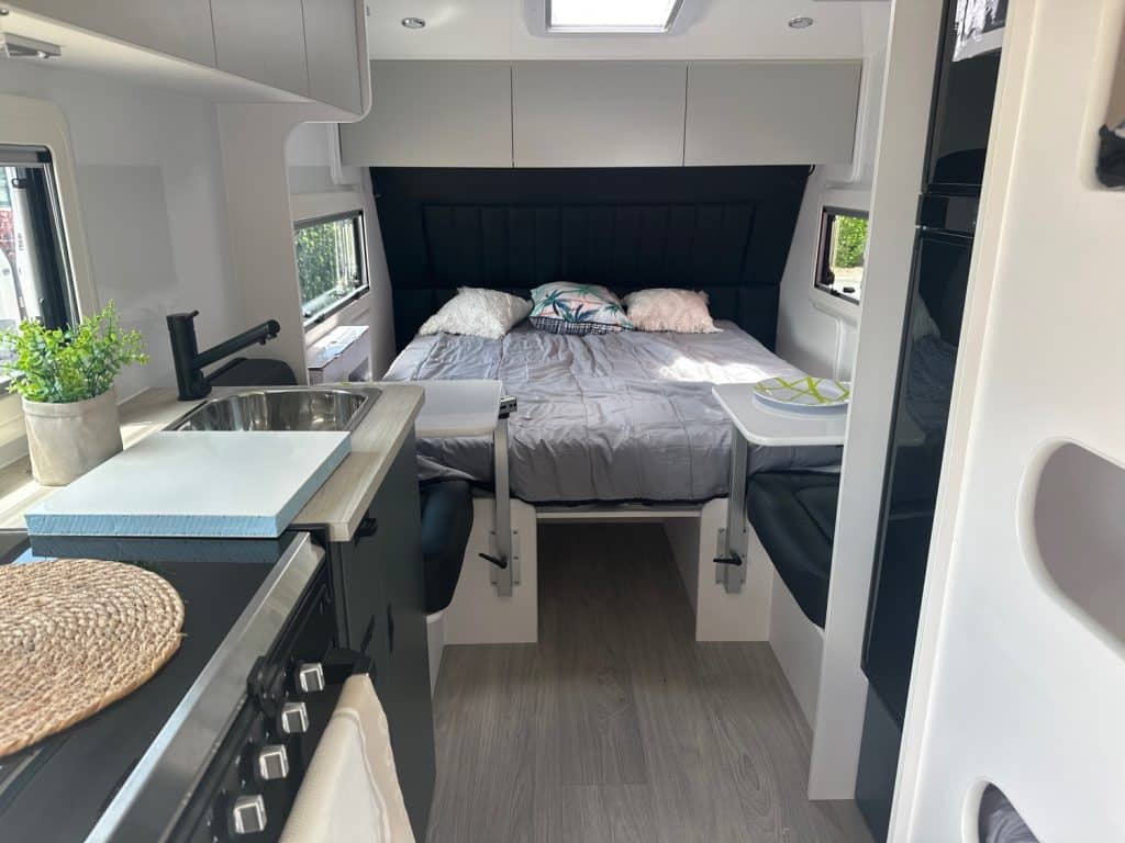 2 x 110lt fresh water tanks and a 110lt grey water tank. The Familia also has a 170lt compressor fridge and double bunks so come on down and