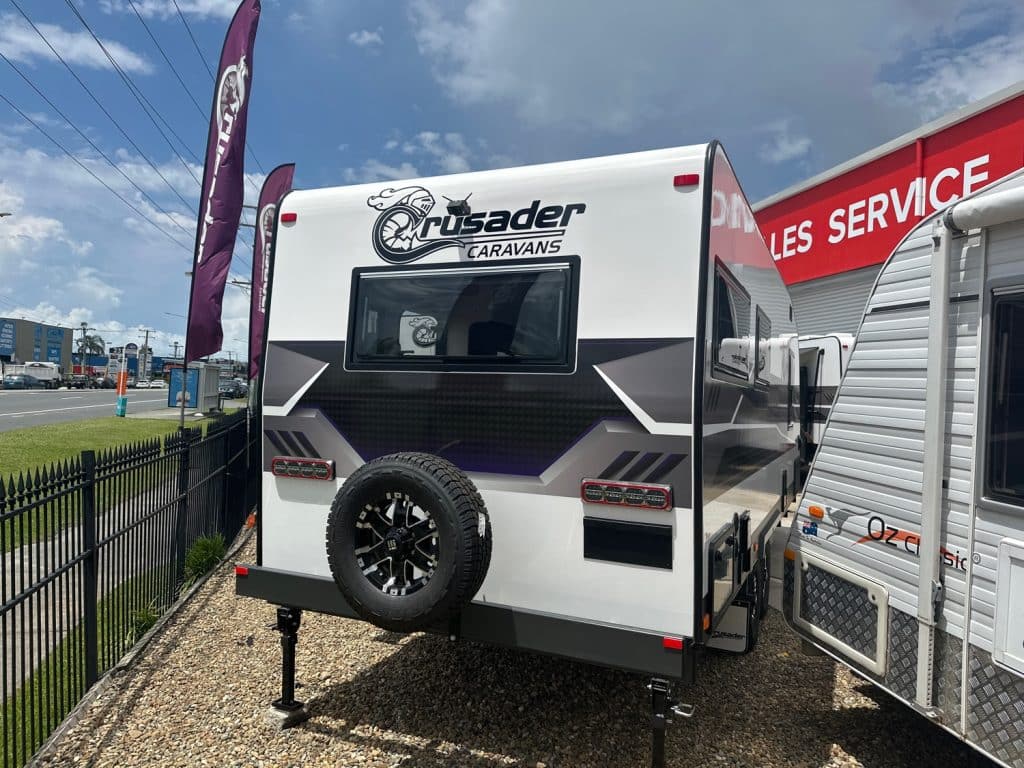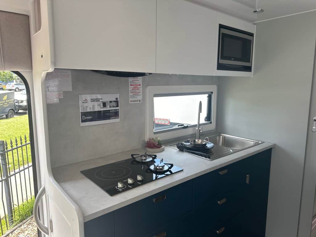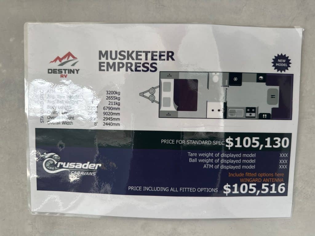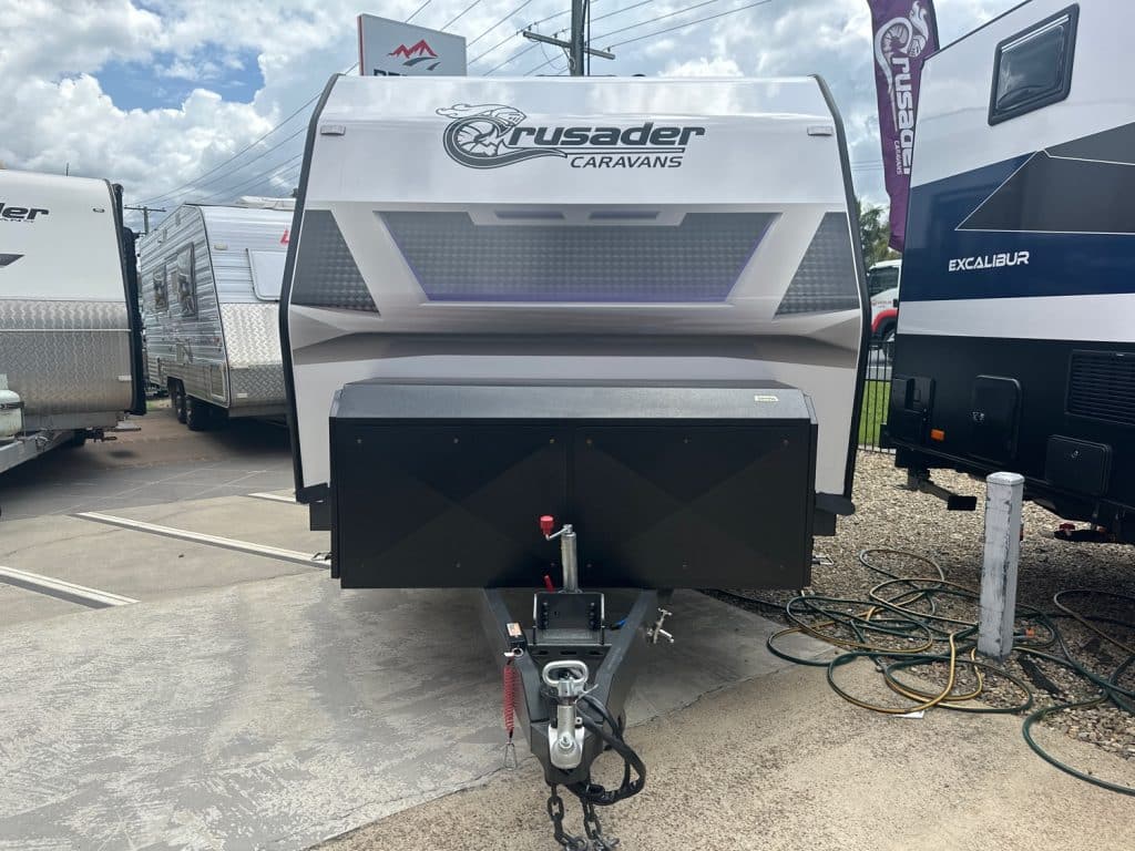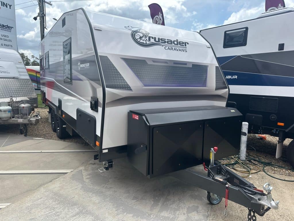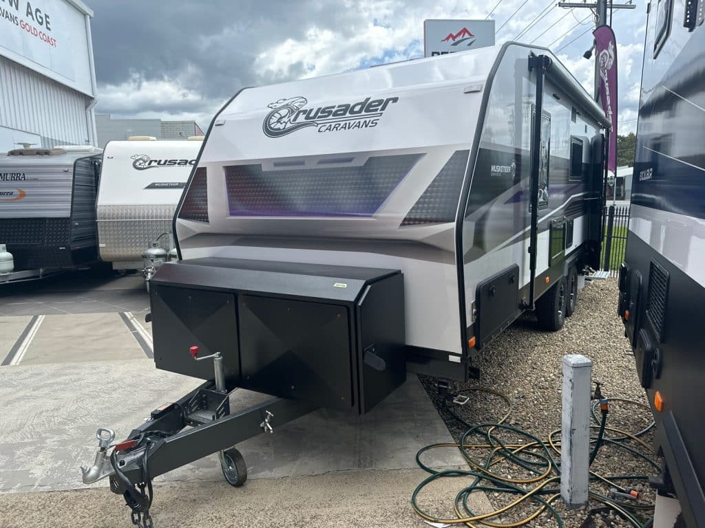 Crusader Musketeer Empress is fitted as standard with Independent coil suspension, with shock absorbers, for an ultra smooth towing experience. Musketeer’s Empress list of creature comforts is the envy of the rest, spacious and thoughtfully appointed. Even the dreary days seem to sparkle as you relax on the club lounge or cook up a storm in the lavishly appointed kitchen with induction cook top. The structure of the Musketeer range is constructed using Crusader lightweight Australian made 42mm fully insulated one piece floor, to insulate against cold or heat creep from the ground, finished in a smooth sided fully insulated composite panel. The Empress offers a large front toolbox with 2 x 9kg gass bottles on a slide out on one side and a generator slide on the other, as well as a large opening tunnel boot, picnic table bluetooth wirless reverse camera, 24″ smart tv and a tv hutch. Your 150ah lithium battery is recharged by the two 200w solar panels or the vehicle whilst towing, you have 2 x 110lt fresh water tanks and a 110lt grey water tank. The Empress also has a large 224lt compressor fridge, 4kg front loader washing machine so come on down and see the all new MY25 Musketeer Empress.Â