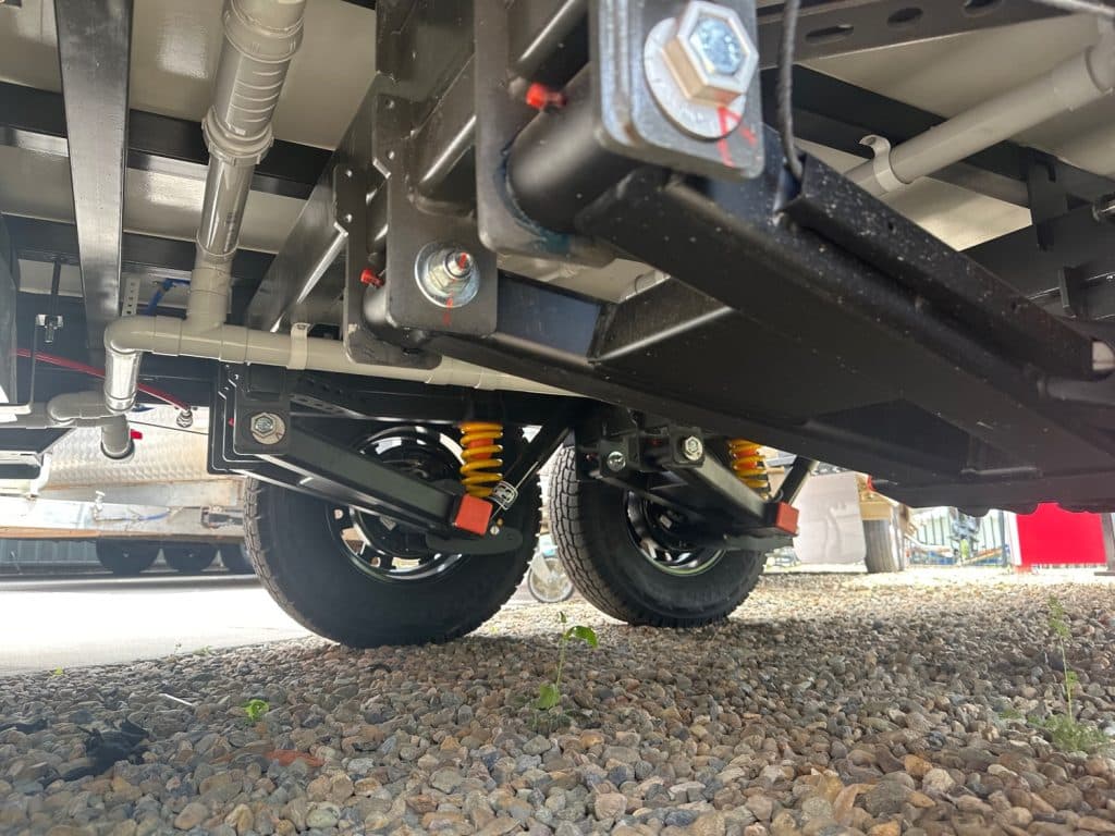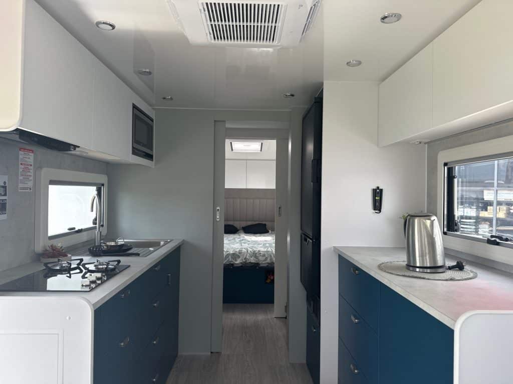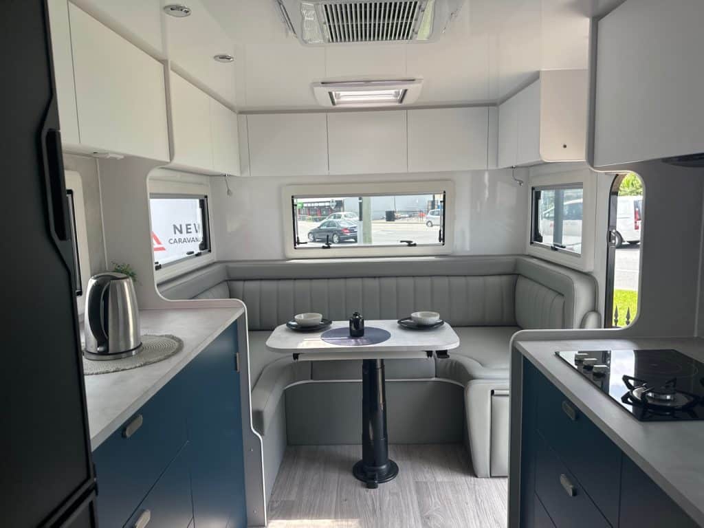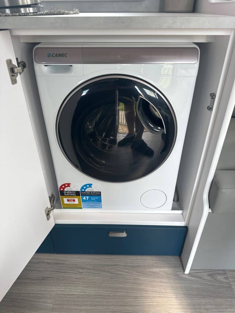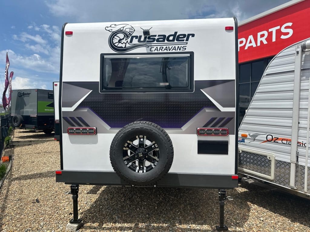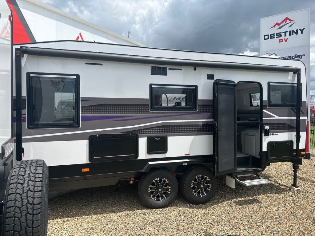 Crusader Musketeer Empress is fitted as standard with Independent coil suspension, with shock absorbers, for an ultra smooth towing experience. Musketeer’s Empress list of creature comforts is the envy of the rest, spacious and thoughtfully appointed. Even the dreary days seem to sparkle as you relax on the club lounge or cook up a storm in the lavishly appointed kitchen with induction cook top. The structure of the Musketeer range is constructed using Crusader lightweight Australian made 42mm fully insulated one piece floor, to insulate against cold or heat creep from the ground, finished in a smooth sided fully insulated composite panel. The Empress offers a large front toolbox with 2 x 9kg gass bottles on a slide out on one side and a generator slide on the other, as well as a large opening tunnel boot, picnic table bluetooth wirless reverse camera, 24″ smart tv and a tv hutch. Your 150ah lithium battery is recharged by the two 200w solar panels or the vehicle whilst towing, you have 2 x 110lt fresh water tanks and a 110lt grey water tank. The Empress also has a large 224lt compressor fridge, 4kg front loader washing machine so come on down and see the all new MY25 Musketeer Empress.Â