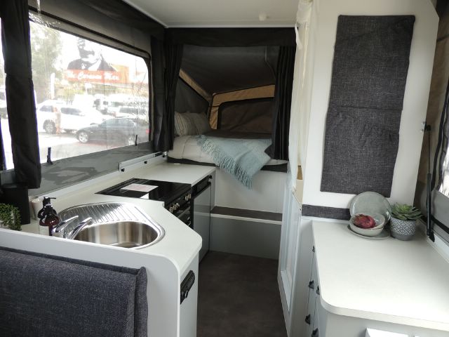 4-Burner Grill, 93L 3-Way Fridge, Ezy Slide Bed on Rollers, Slide-Out Pantry (most models), Fully Recessed Door Furniture, Large Drawers on Bearing Slides, Table to Bed Converter, Microwave (Except Wing 3 ST), Front Queen Size Bed, Ezy Glide Curtains, 12-Volt LED Roof Lights, 15mm Ply Furniture, 12-Volt Pump to Sink.
