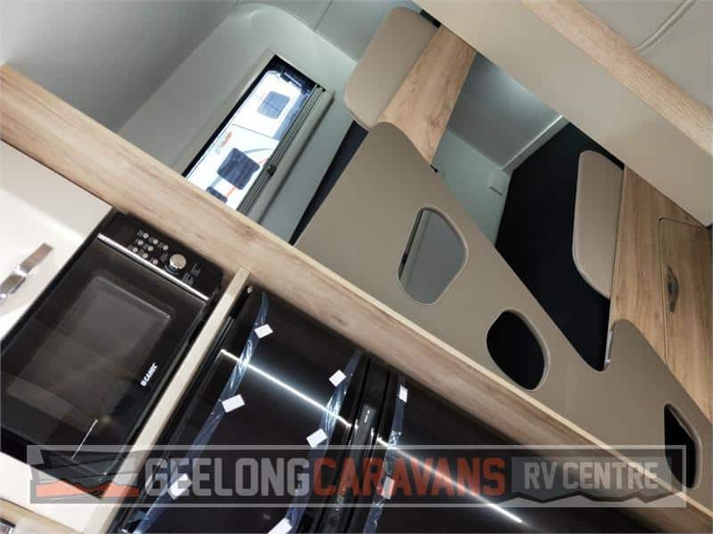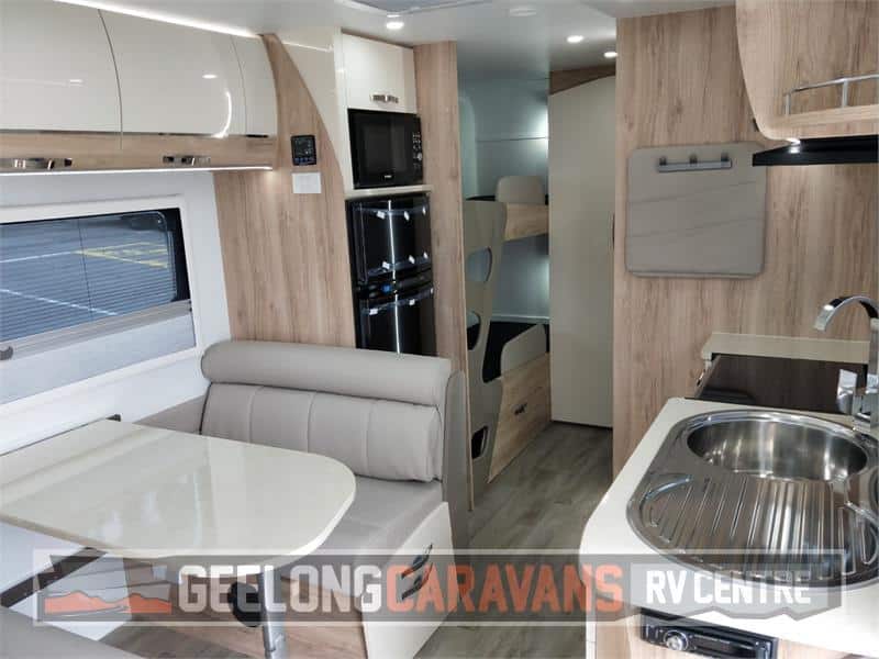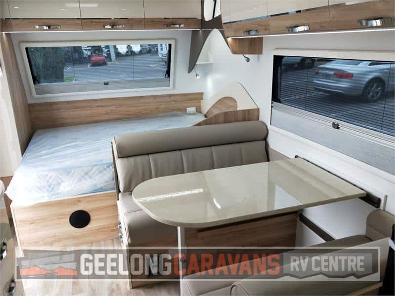 Latest Release TOURER 577 Double Bunk Van with Independent coil suspension. Perfect Single axle Touring van for the family. Full hard roof offers greater internal height and fully insulated walls. Latest fla style double glazed windows and security door. Extended A frame with extra large front tool box ( slide out tray ) Luxury finish Style pack cabnietry and Ambiance LED lighting through out. Booster pack offer 2x 100 amphr batteries & 160WATT solar panel
