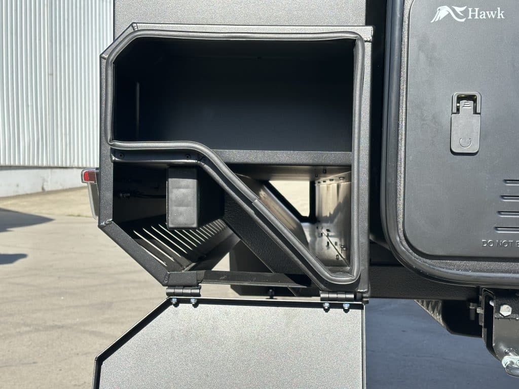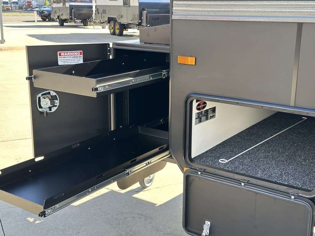 – New 2025 Raptor Coated Toolbox with built in stone guard and wood box and Slide Out Drawers for your gas bottles and fridge/BBQ slide so you can organize and access your gear with ease.