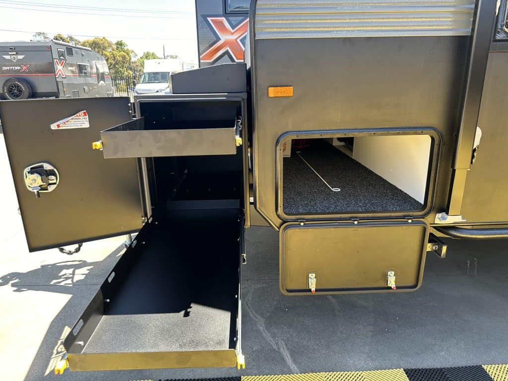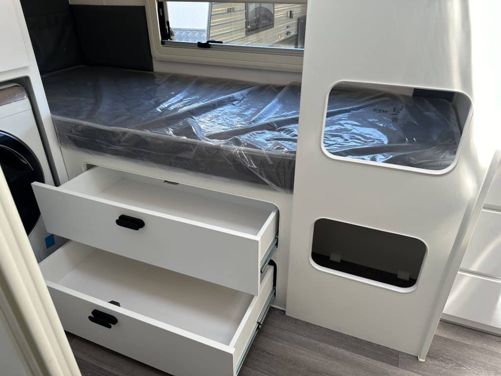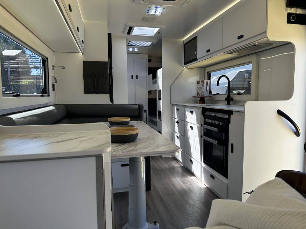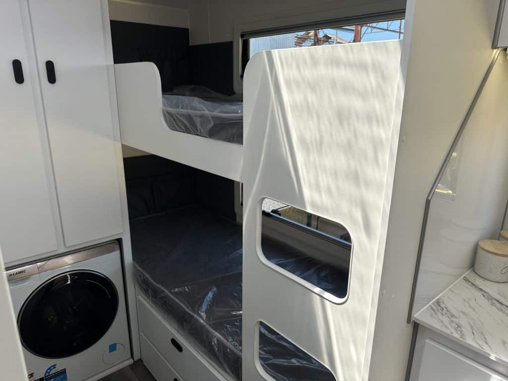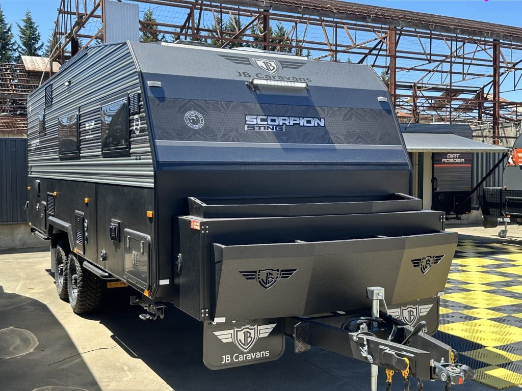 Introducing the 2025 21’6 Scorpion Sting Family Bunk – your ultimate companion for the next stage of your caravanning adventure. With its rugged exterior and luxurious interior, the Scorpion Sting promises to take you off-road to the heart of outback Australia, offering comfort and style every mile of the way. Custom Build your full off road Scorpion Sting! – Choose from over 100 Different colour options! Giving you full creative control to personalize your dream van! – Available in 14 Layouts + Bunk options. Backed by a full off road 5 Year Structural Warranty and 3 Year Manufacturing Warranty! Take this van anywhere in Australia with no limitations. The JB group has Dealers across the entire country that can service your van while you travel. Standard Features on the Scorpion Sting Redefining Adventure… Chassis: – Timber-less construction, One Piece roof with PVC frame allowing for full custom builds. – 6″ A-frame, 6″ Mainframe with 2″ raiser – 4.5T Cruise Master ATX Suspension so you enjoy a smooth and stable ride, even on rough terrain. – ALKO ESC, Anti-Sway Control to enhance safety and control during towing. – DO45 Swivel Hitch so you can move effortlessly while towing off road -4.5T Chains – Under-body protection Power and Electrical System: – EcoFlow 5kWh Electrical System (416A Lithium Battery), Expandable to 10kWh or 15kWh ! – 3600W Inverter wired to all power points. run your Aircon, Air Fryer, Coffee Machine, Washer, Microwave and more! – 4 x 24V 200W Solar Panels: Leave your generator at home. – Bluetooth connection to the Ecoflow power hub to monitor your usage and input on the go Water and Plumbing: – 2 x 110L Fresh water tanks, Monitored via the Ecoflow system – 1 x 65L Dedicated Drinking tank with separate pump. – 1 x 110L Grey Water Tank enabling you to free camp in national parks – All tanks come with full under-body protection – Separate Toilet and Shower so you can enjoy privacy and convenience with dedicated facilities. Interior Comfort and Convenience: – 2 x Sirocco Fans ensuring optimal air circulation and comfort inside. – Piano Hinges Throughout to enhance durability and aesthetics. – New Stone Benchtops bringing a luxurious finish in the kitchen area. – 224 Litre Compressor Fridge to keep food and beverages fresh and cold efficiently even in extreme heat. – Gas/Electric Oven so you can cook delicious meals wherever you roam. – Reverse Cycle Air Conditioning enabling you to stay comfortable in any climate. – Gas Heater for those cold nights – Instant Hot Water System providing hot water on demand anywhere! – Dometic Dust Reduction System ensuring you maintain a clean and dust-free interior while travelling through dust. – LED warm white strip lighting for a better ambience at night. – Pre-wired for Starlink now standard. Exterior Features: – New 2025 Raptor Coated Toolbox with built in stone guard and wood box and Slide Out Drawers for your gas bottles and fridge/BBQ slide so you can organize and access your gear with ease. – Safety Dave Dual Rear View Camera for added safety towing on the road and park confidently with enhanced visibility. – Marine Carpet to Tunnel Boot and Entertainment Hatch to add extra durability for high-use in outdoor areas. – 2 x Jerry Can Holders to extend your travel time and carry additional fuel or water. – New 2025 Rear Bumper with built in pole carrier and jerry can holders Enquire today to find out how soon you can get yourself into this incredible off road beast!