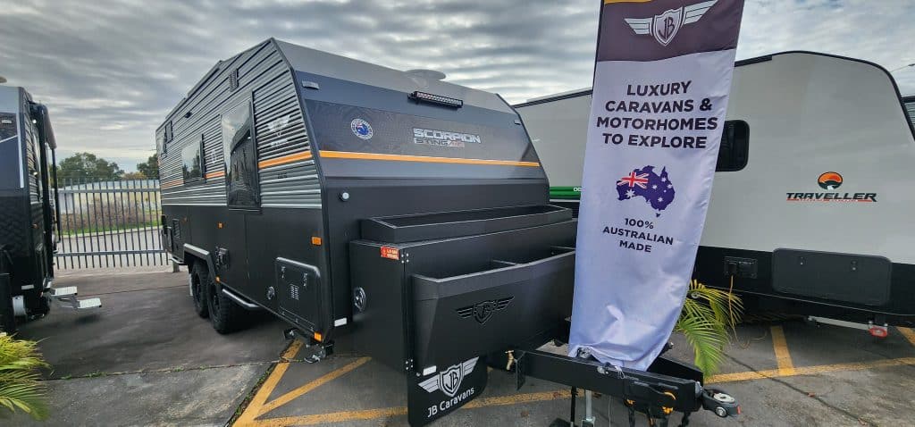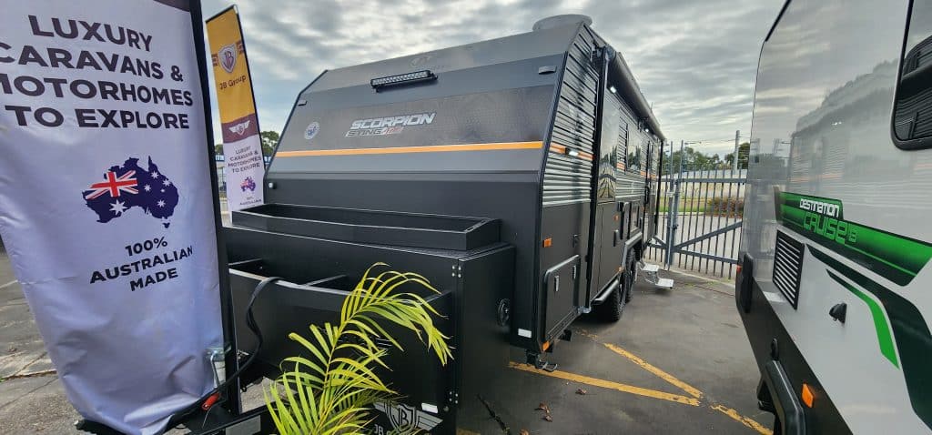 It’s here! Yes, the all new 2025 model Scorpion Sting Air 20’6 has arrived, boasting new internal and external features, we’re sure you will love these new features so why not come on down to the yard and a look for yourself. New 2025 features: * New design toolboxes front and rear. * Gone has the checker plate and replaced with smooth Duratec Black Powder coated Aluminium * New internal house lighting * Gone has the bulkhead lighting, now replaced with strip lighting * Gone has the timber framework and replace with Poly resin frame (recycled plastic and resin) Standard features: * 10Kw (832amp/hr) Eco Flow battery system * 3600w Inverter * 300w AC Charger * 1000w DCDC Charger * 5 x 200w solar panels (24V) * EcoFlow Intergrated water gauges – all in one screen * 2 x 110L water tanks, 1 x 65L dedicated drinking tank with separate pump and 110L grey water tank * Carafan dust reduction system * External slide out kitchen * And much more…. To view the new 2025 Scorpion Sting Air 20’6 drop in to our yard at 28 – 32 Brookland Street Beckenham, Paul, Wayne or Steve will be happy to show you around, like to know more? then call Wayne 0422 471 579 or Steve E 0419960121 or Paul 0450 366 811