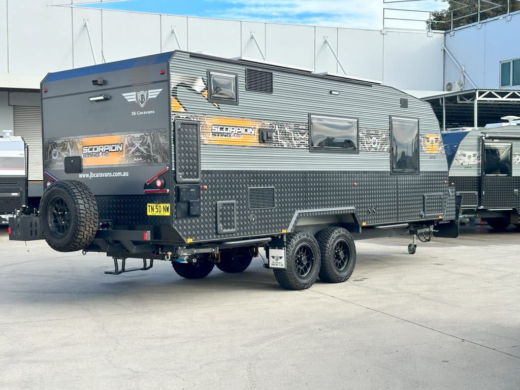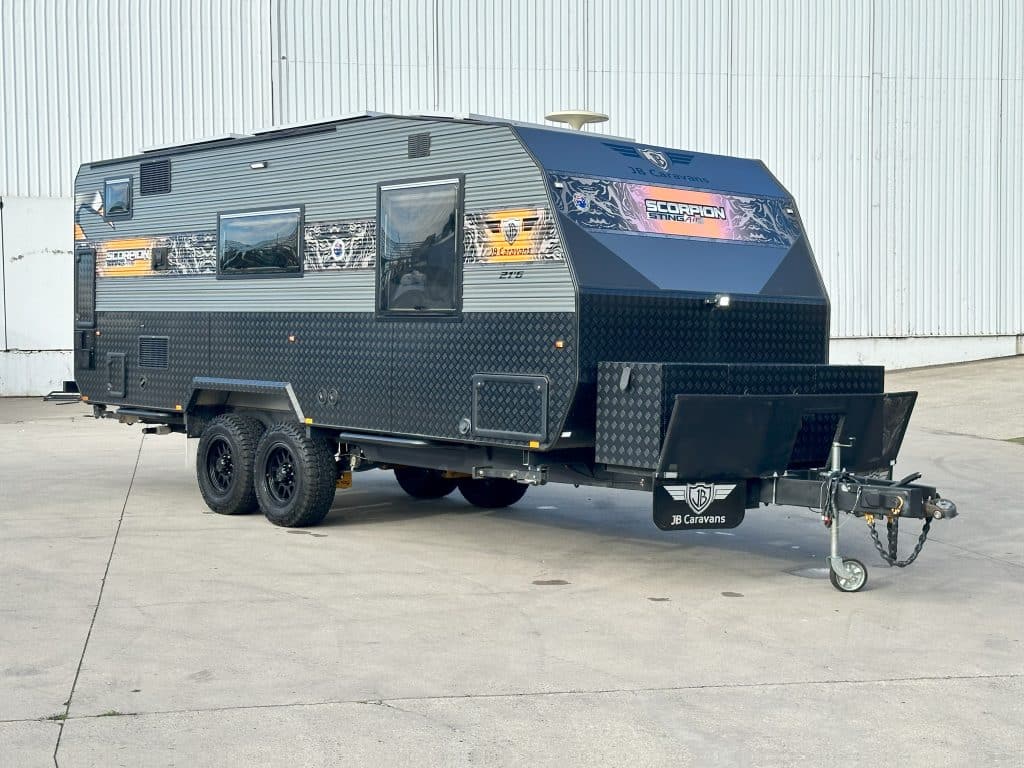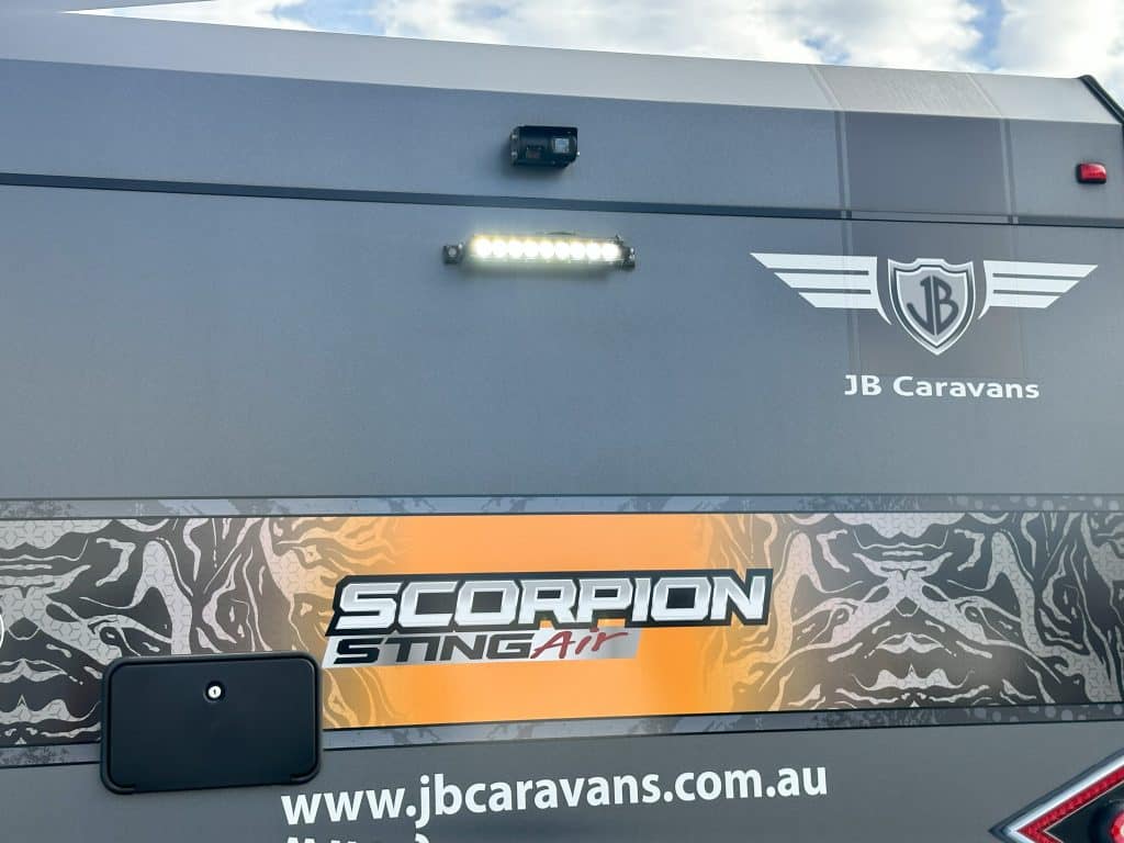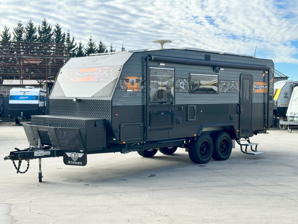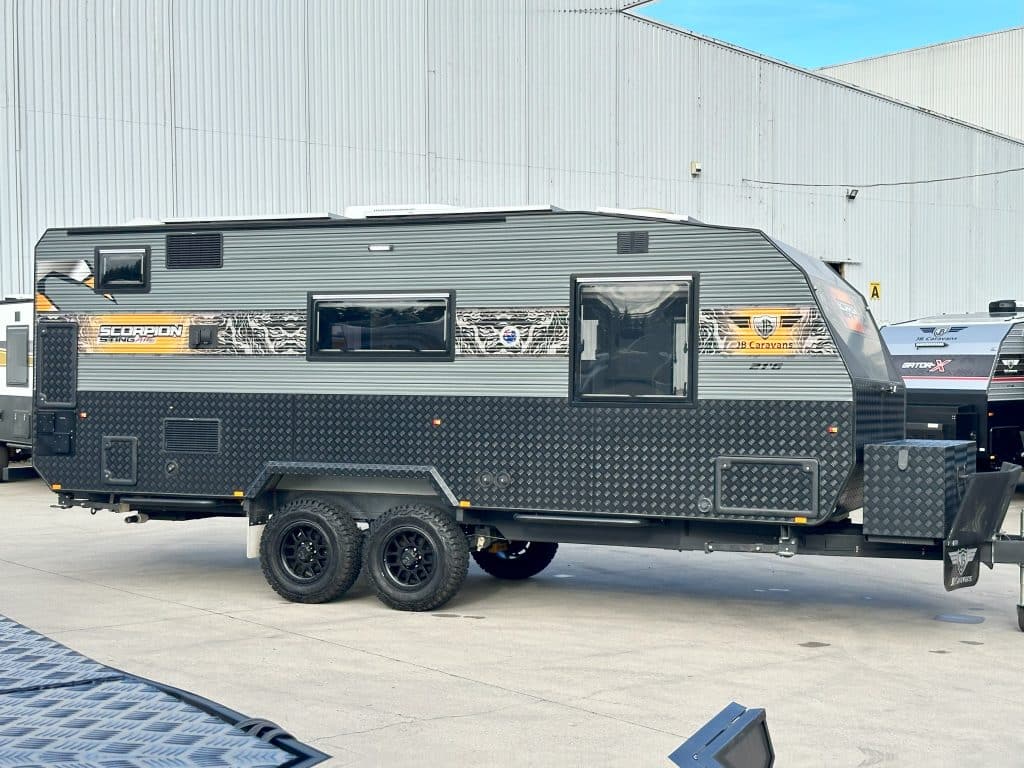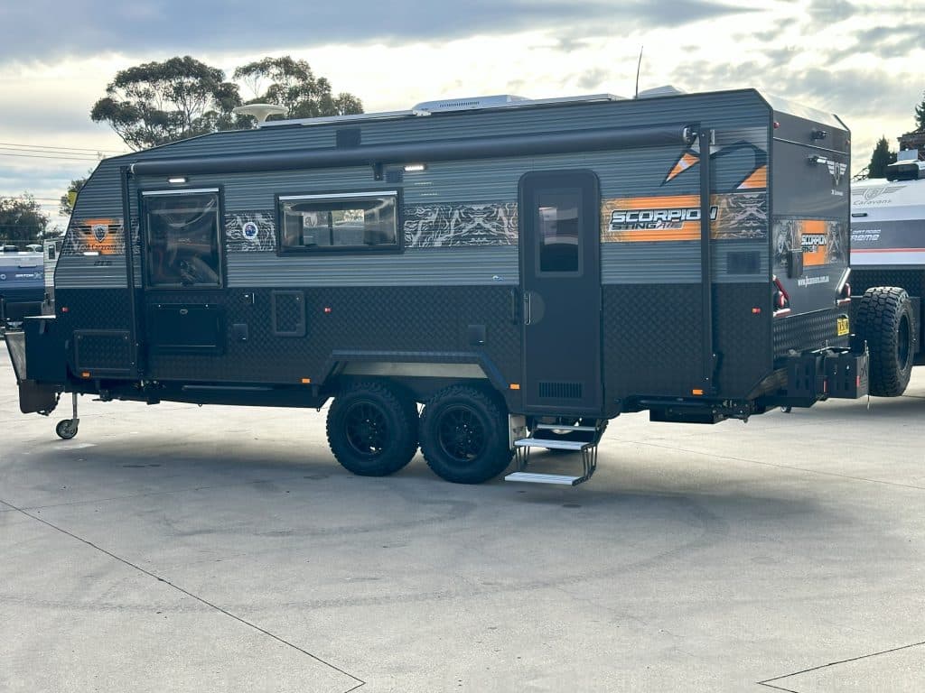 Introducing the Most Talked about Scorpion STING AIR 21’6 CLUB LOUNGE. With Heaps of Extras listed below, this is set up for Free Camping and off Road travels. – 4.5T Capacity AIRBAG Cruisemaster ATX Suspension – LEVEL-3 – On-Board Compressor Built in – 10kWh (833amp/hr) EcoFlow Lithium Battery – 5x 200W Solar Panels (1000W total) – 3600W Inverter with Aircon wired through. – One piece Honeycomb floor – 6″ Chassis – 224L Compressor Fridge/Freezer – Truma Vario Hear Gas Heater – Dometic Dust Reduction System – Full Oven – Fusion MS-RA770 Touch Control Radio System + External Remote + Speakers – 24″ Smart LED TV – Dual Reverse Camera with Car Monitor – Dometic FreshJet Reverse Cycle Air Conditioner – 3 Kg Top Loader Washing Machine – 2 X 12V Sirocco Fans in Bedroom – 12″ Electric Brakes – 17″ Mickey Thompson Tyres – Al-Ko ESC (Electronic Stability Control) – 95L and 65L Fresh Water Tanks (With LED Gauges) – 1 X 65L Dedicated Drinking Water Tank with LED Gauge (with separate 12V Water Pump, filler, Filter. Total 2 X 12V Water Pumps) – 1 X 95L Grey Water Tank (With LED Gauge) – 4 Arm Heavy Duty Bumper – All Tanks with Chequer Plate Protection (Also with Plumbing Protection) – DO45 Off-Road Independent Hitch and 4.5T Rated Chains – Massive Toolbox with 2 X Slide outs on each side (BBQ and Generator) – 2 X 9 Kg Gas Bottles Secured in Toolbox with Ventilation – 2 X Jerry Can Holders – Full raptor Chassis – Soft Close Drawers – Sail Track – Nudge bars on sides (Rock Sliders) – Recovery Points at Rear – Stone Guard – Jack and Wheel Brace Supplied – Full Club Lounge with Cushion to make a bed – Luxury Stitched Upholstery (Real Australian Leather) – Pelmets and Roman Blinds – 4 Way Lock on Main Door – Security Mesh Door – LED Step Light – External Shower – Pole Carrier – LED Flood Lights at Front, Rear and Driver Side of Caravan – 25L Microwave – 12V Touchscreen Range hood – Double Electric Step – Dometic Double Glazed Windows with Fly Screens and Clock out Blinds to all Windows – And Lot More……….