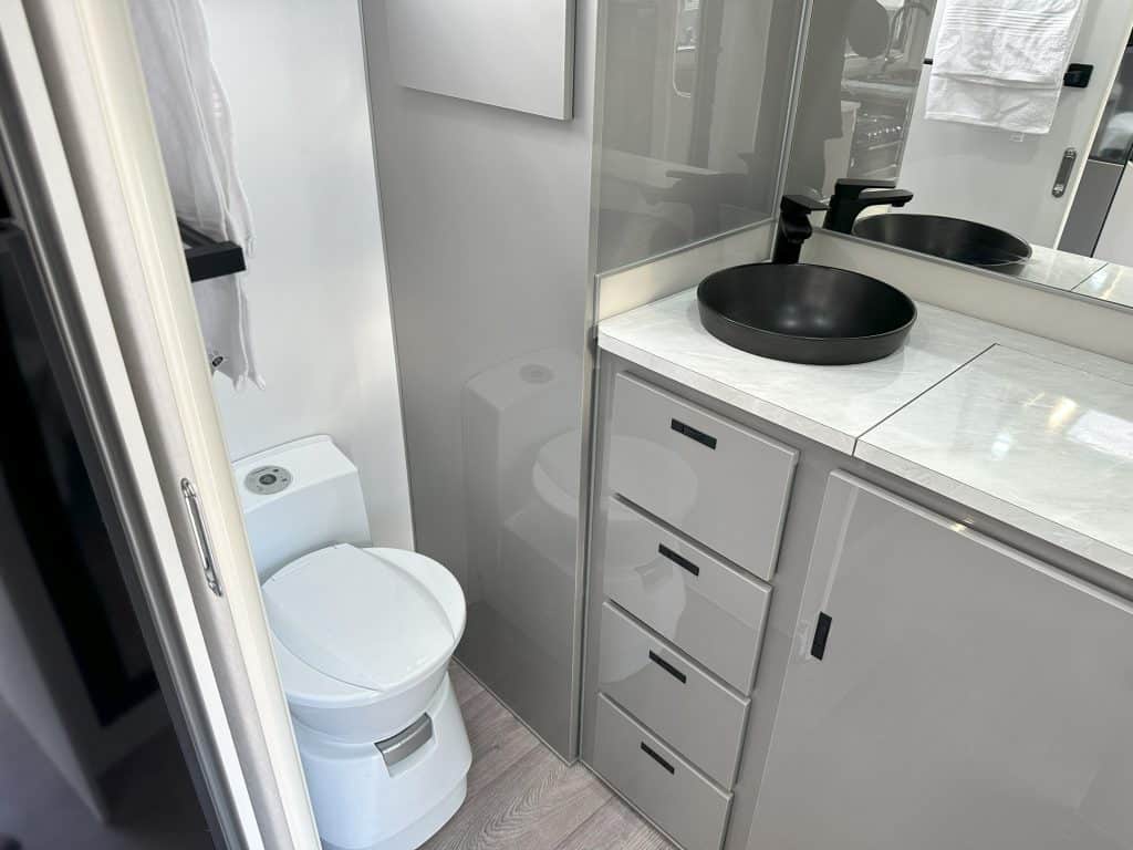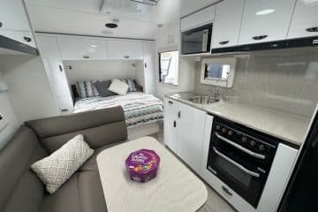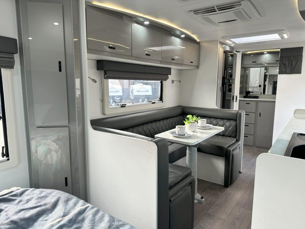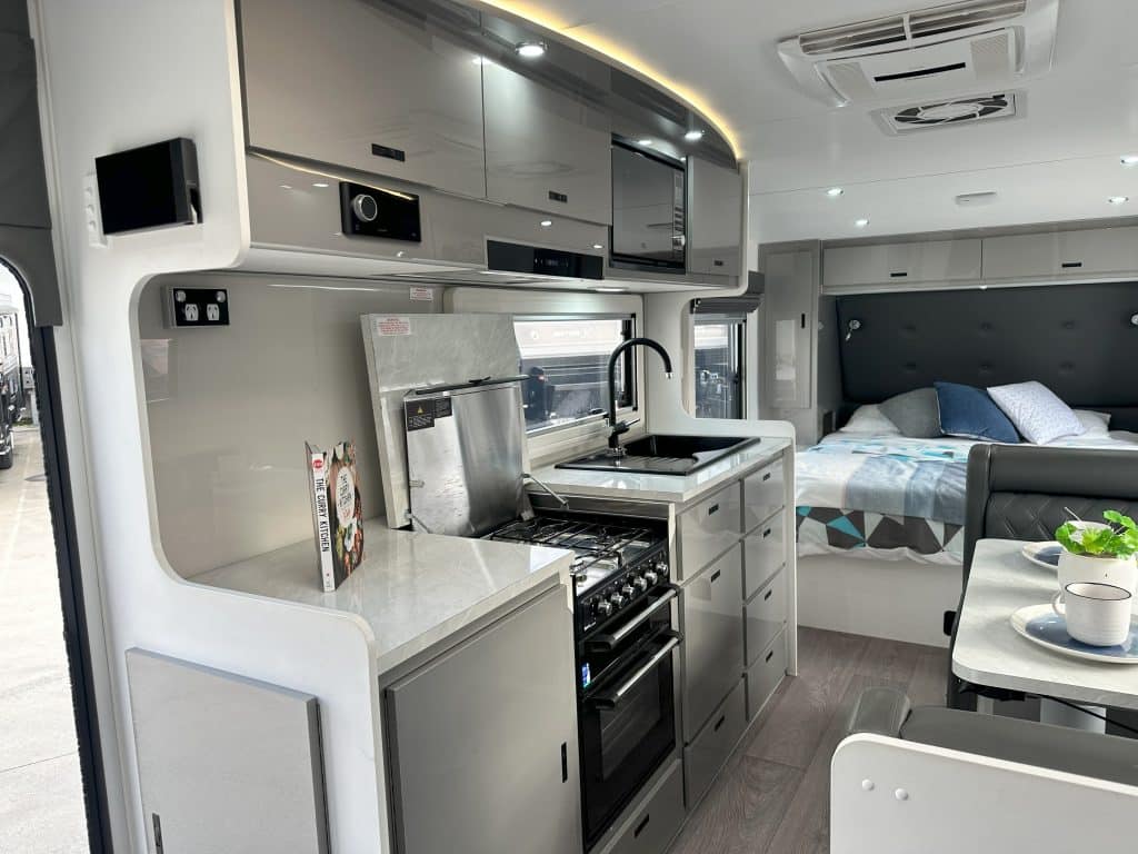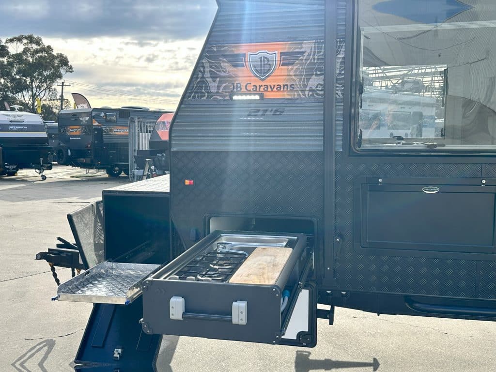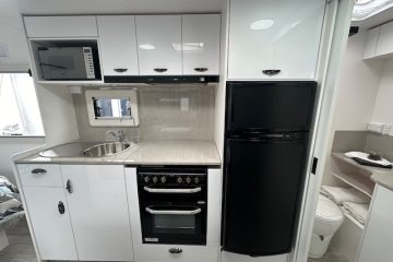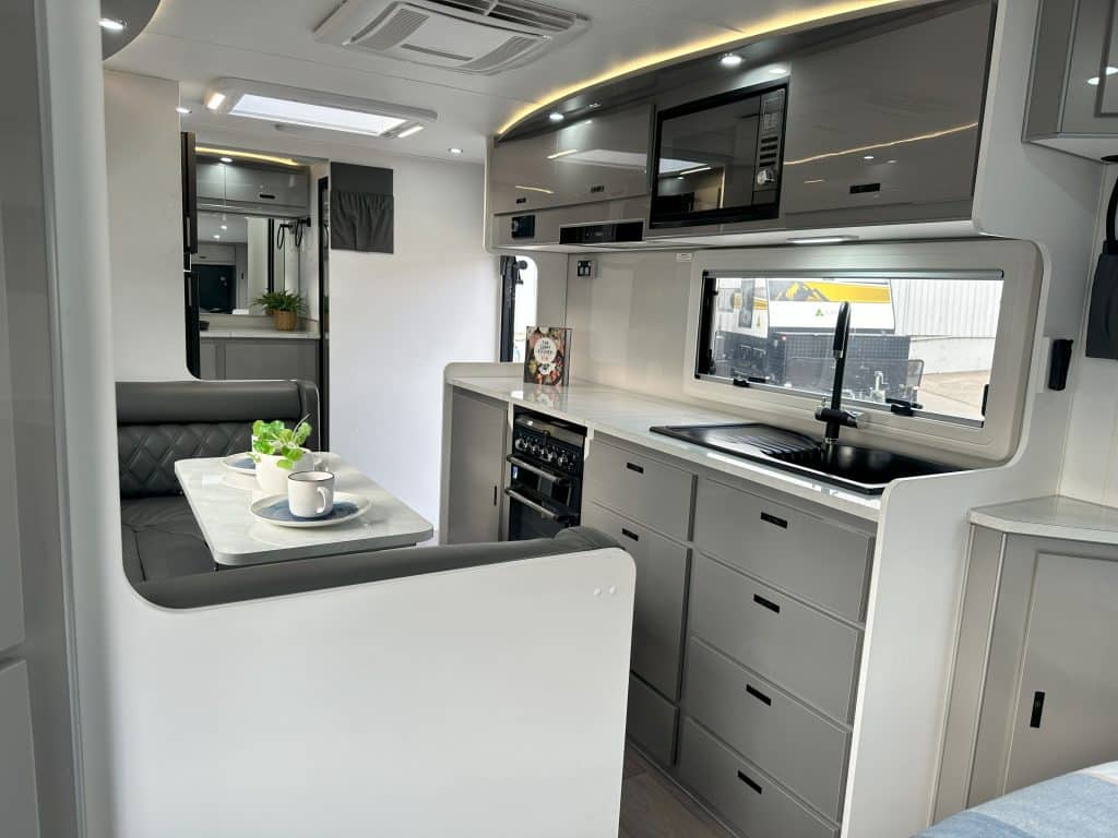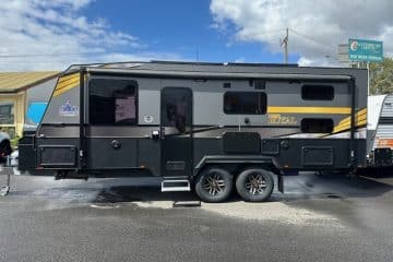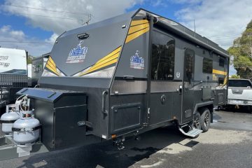 Introducing the Most Talked about Scorpion STING AIR 21’6 CLUB LOUNGE. With Heaps of Extras listed below, this is set up for Free Camping and off Road travels. – 4.5T Capacity AIRBAG Cruisemaster ATX Suspension – LEVEL-3 – On-Board Compressor Built in – 10kWh (833amp/hr) EcoFlow Lithium Battery – 5x 200W Solar Panels (1000W total) – 3600W Inverter with Aircon wired through. – One piece Honeycomb floor – 6″ Chassis – 224L Compressor Fridge/Freezer – Truma Vario Hear Gas Heater – Dometic Dust Reduction System – Full Oven – Fusion MS-RA770 Touch Control Radio System + External Remote + Speakers – 24″ Smart LED TV – Dual Reverse Camera with Car Monitor – Dometic FreshJet Reverse Cycle Air Conditioner – 3 Kg Top Loader Washing Machine – 2 X 12V Sirocco Fans in Bedroom – 12″ Electric Brakes – 17″ Mickey Thompson Tyres – Al-Ko ESC (Electronic Stability Control) – 95L and 65L Fresh Water Tanks (With LED Gauges) – 1 X 65L Dedicated Drinking Water Tank with LED Gauge (with separate 12V Water Pump, filler, Filter. Total 2 X 12V Water Pumps) – 1 X 95L Grey Water Tank (With LED Gauge) – 4 Arm Heavy Duty Bumper – All Tanks with Chequer Plate Protection (Also with Plumbing Protection) – DO45 Off-Road Independent Hitch and 4.5T Rated Chains – Massive Toolbox with 2 X Slide outs on each side (BBQ and Generator) – 2 X 9 Kg Gas Bottles Secured in Toolbox with Ventilation – 2 X Jerry Can Holders – Full raptor Chassis – Soft Close Drawers – Sail Track – Nudge bars on sides (Rock Sliders) – Recovery Points at Rear – Stone Guard – Jack and Wheel Brace Supplied – Full Club Lounge with Cushion to make a bed – Luxury Stitched Upholstery (Real Australian Leather) – Pelmets and Roman Blinds – 4 Way Lock on Main Door – Security Mesh Door – LED Step Light – External Shower – Pole Carrier – LED Flood Lights at Front, Rear and Driver Side of Caravan – 25L Microwave – 12V Touchscreen Range hood – Double Electric Step – Dometic Double Glazed Windows with Fly Screens and Clock out Blinds to all Windows – And Lot More……….