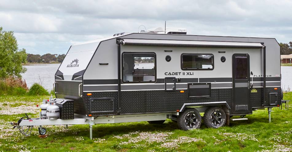 Apart from the coloured exterior the Cadet 2 comes with 3.3t AL-KO Enduro Cross Country suspension, dual solar panels, dual batteries, checker plate protection for off grid capabilities. It also boasts a front tunnel boot, slide-out bbq, gas bayonet and a fold-out picnic table, reverse camera and double bike rack!