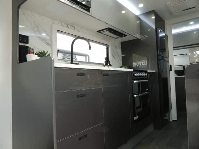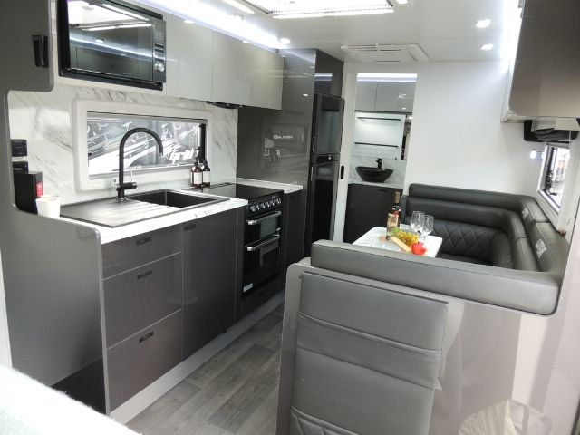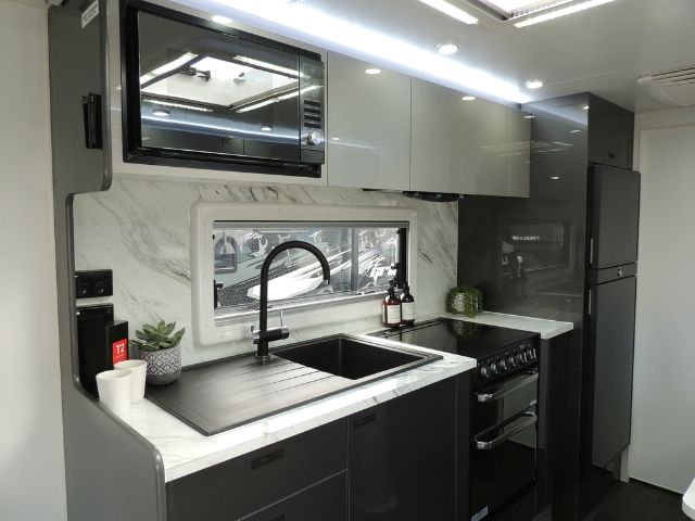 Outside, this van is ready to battle any condition but inside are all the hallmarks of luxury, with premium benchtops, matte black sinks, taps and hardware, matching unique interlocking cabinetry. The Fusion premium entertainment system takes audio to the next level while the endless hot water service ensures the most comfortable off-road lifestyle imaginable.