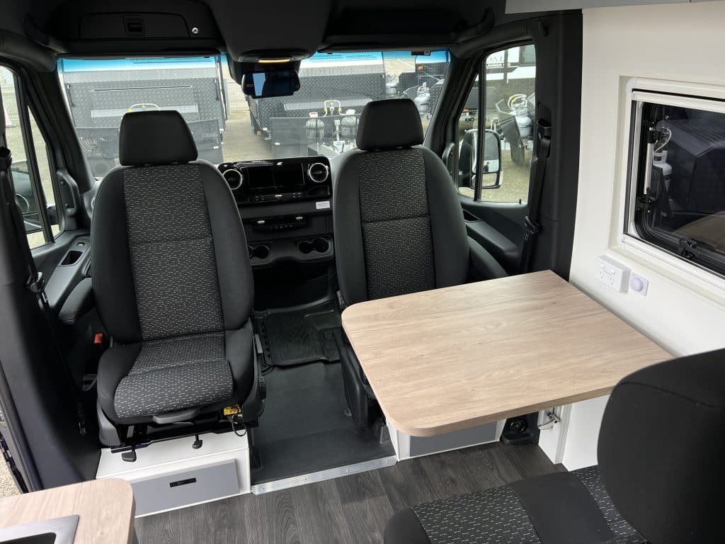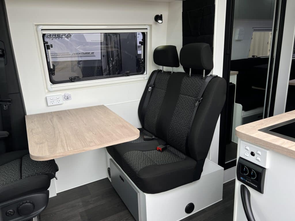 Double row seat with integrated seatbelts, storage below & above, adjustable Lagoon table leg, double powerpoint, map reading light & USB/USBC port