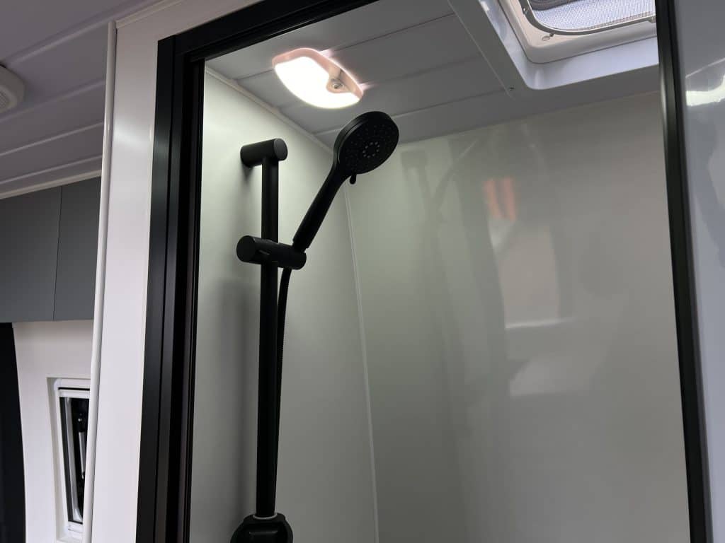 Shower with mirror door, black shower head, hatch/fan, sink & soapbox with mirror