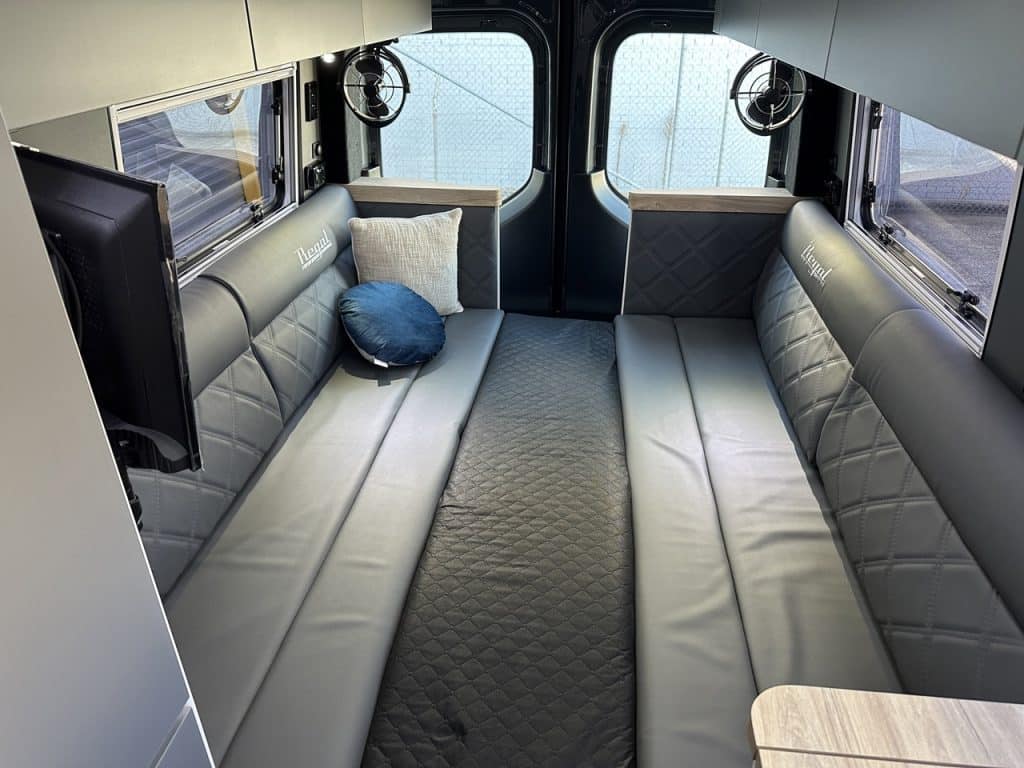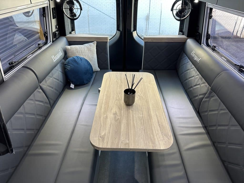 Large seating area with map reading lights, USB/USBC Ports, LED strip lighting, double power points & privacy curtains