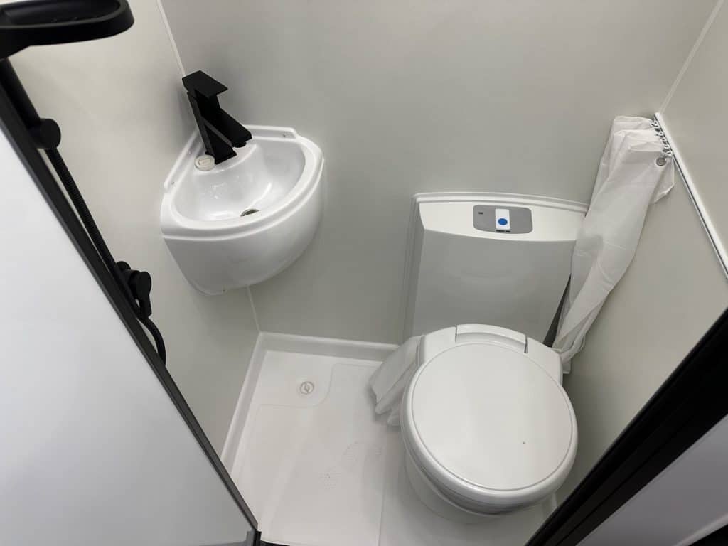 Shower with mirror door, black shower head, hatch/fan, sink & soapbox with mirror