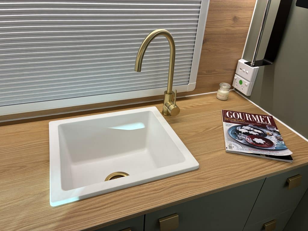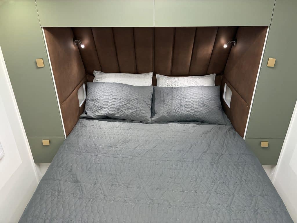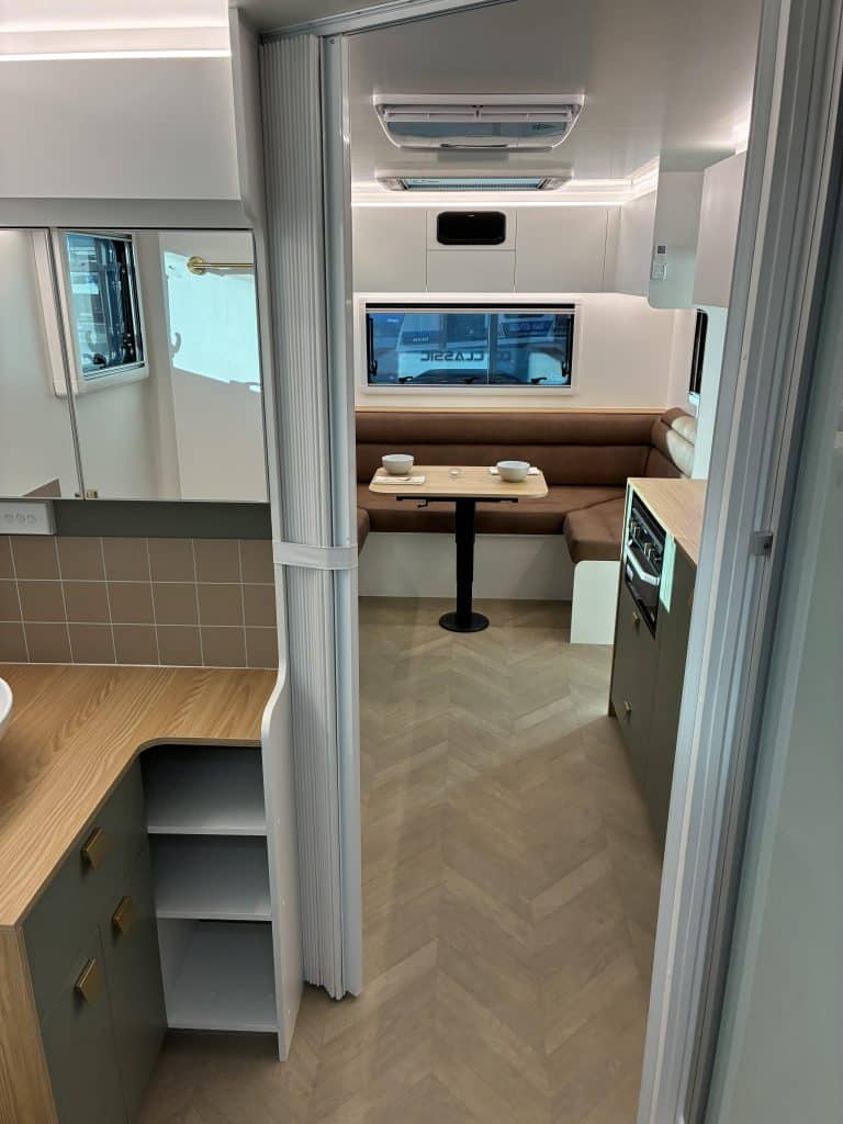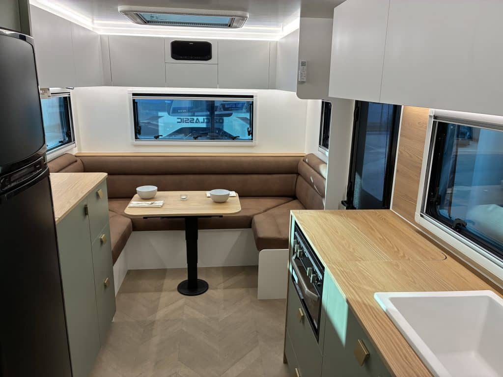Featuring the ALL NEW New Age sandwich panel composite design. TONNES of storage space. Stunning interior design with EXLUSIVE finishes that redefine luxury Features added to this caravan * Leatherette upholstery This caravan has the following great standard features: * Queen Island bed with storage underneath * Massive Café seating with tri-fold table * Double sink * Spacious full ensuite with extra cupboard space * Microwave * 199L Thetford 3 way fridge and freezer * Inline water filter * 2x oscillating fans * 2x FUSION all in one sound panels * PROJECTA battery management system with 7inch display * 600 WATTS total solar * 2x 110AMP hour Lithium batteries * Reverse camera * 16 inch AT tyres * Roller rocker suspension * 2x 110L fresh water tanks * 1x 110L grey water tank and much much more….!