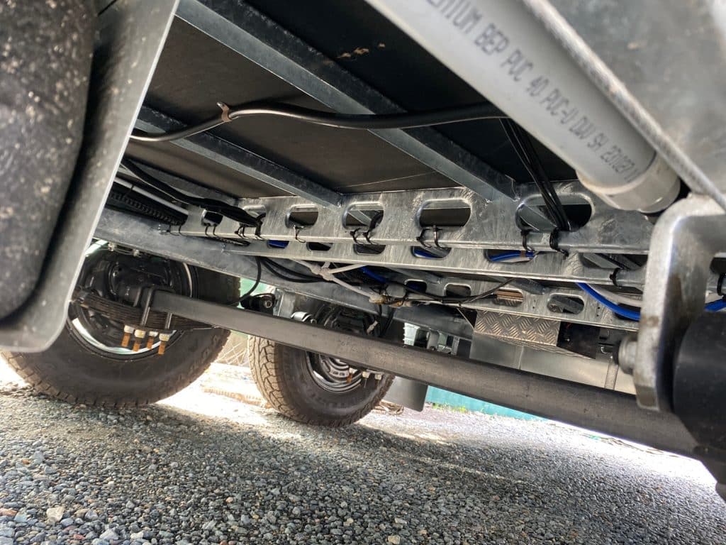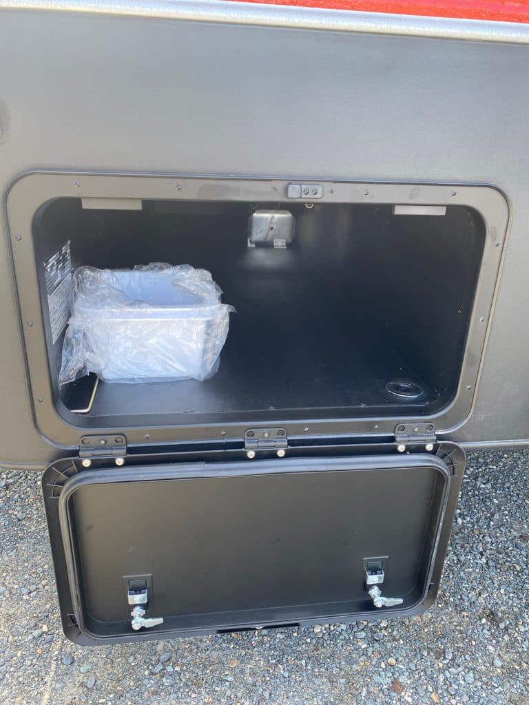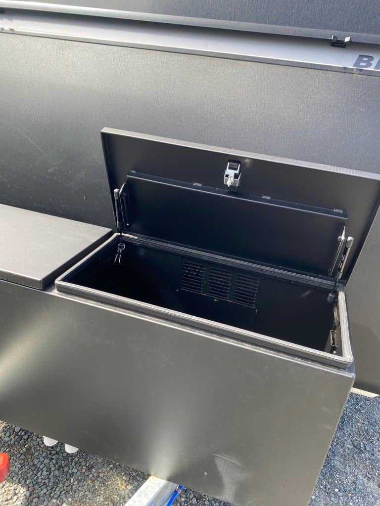 Standard with air conditioning, front toolbox, electronic sway control, batteries and solar, it is ready to hook up and travel in comfort.