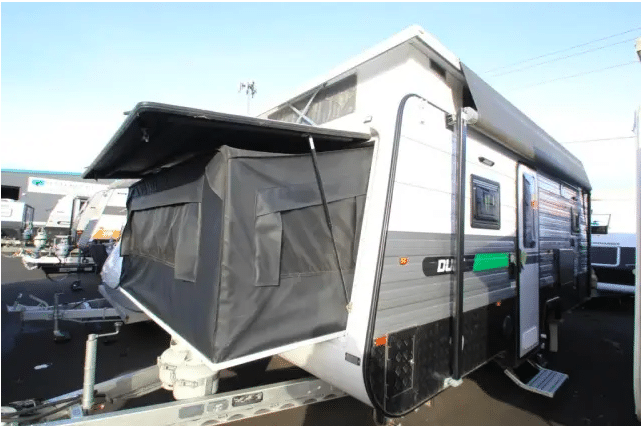 This Paramount Duet Extenda Poptop will sleep between 5-6 people with the 2 double expanda bed ends and a drop down table for a bed conversion, it will also seat 6 people. The kitchen has a Thetford Minigrill with 3 gas, 1 electric cooktop, a Thetford 128lt 3 way fridge and an NCE microwave. The extenda bed ends feature full block out material, so you won’t get woken up early with the sunlight shining through the walls. External features include 2 x gas bottles, water tank, leaf spring suspension and 15” wheels on a single axle. If this sounds like the caravan for you, head on down to our Dealership in Bayswater Nth, Victoria and check it out. Also, on site for your convenience is a 2 storey accessories/spare parts shop, indoor showroom and a service and repair workshop capable of completing all your insurance needs as well!