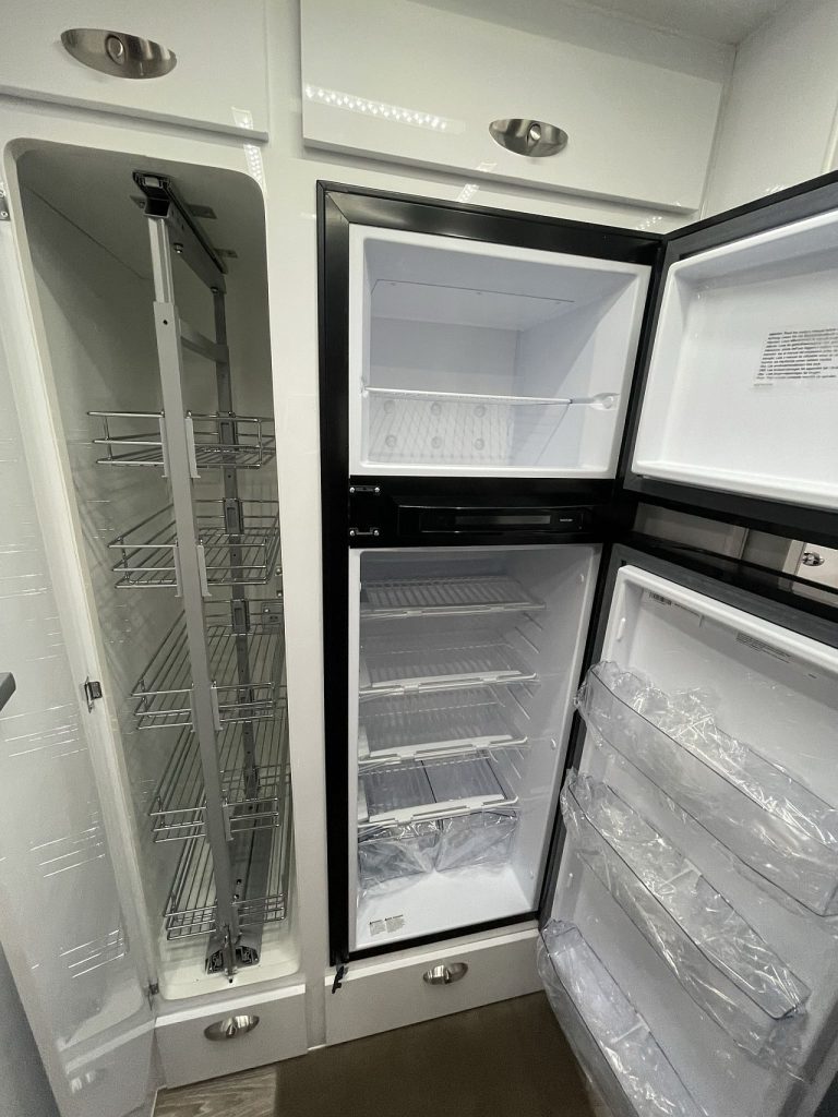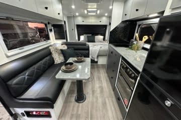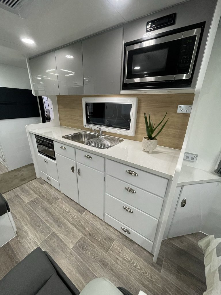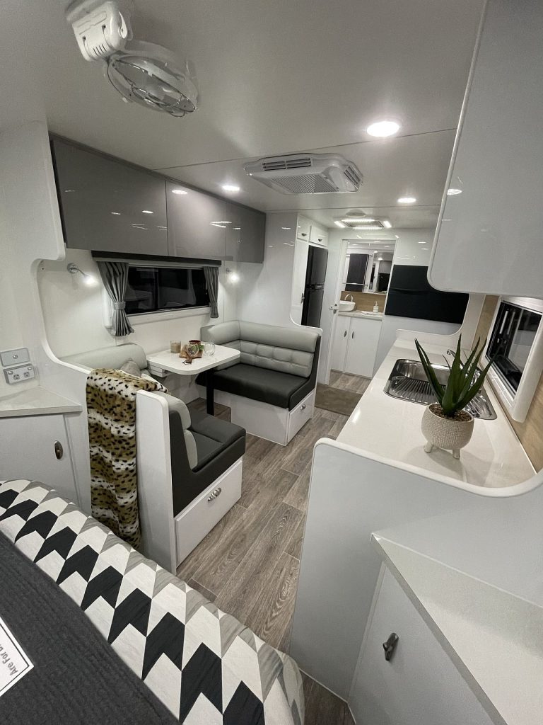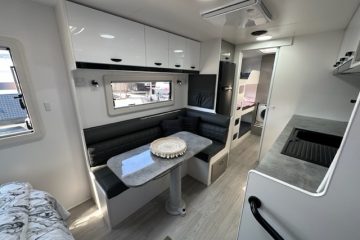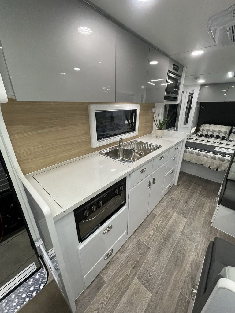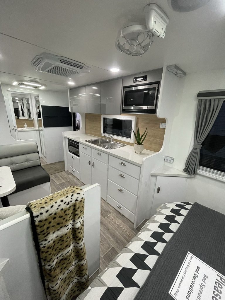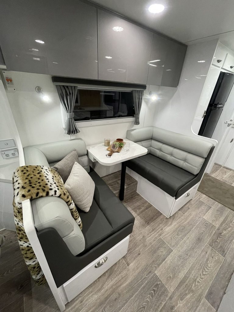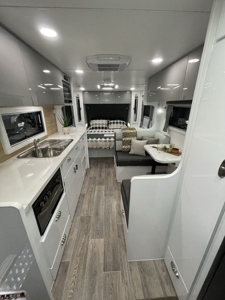 As you walk down the caravan you have the 184 ltr 3-way fridge with full height pantry & Cafe seating. To the left you have a large kitchen with loads of bench space, full drawers, microwave, 4 burner grill & Stainless sink.