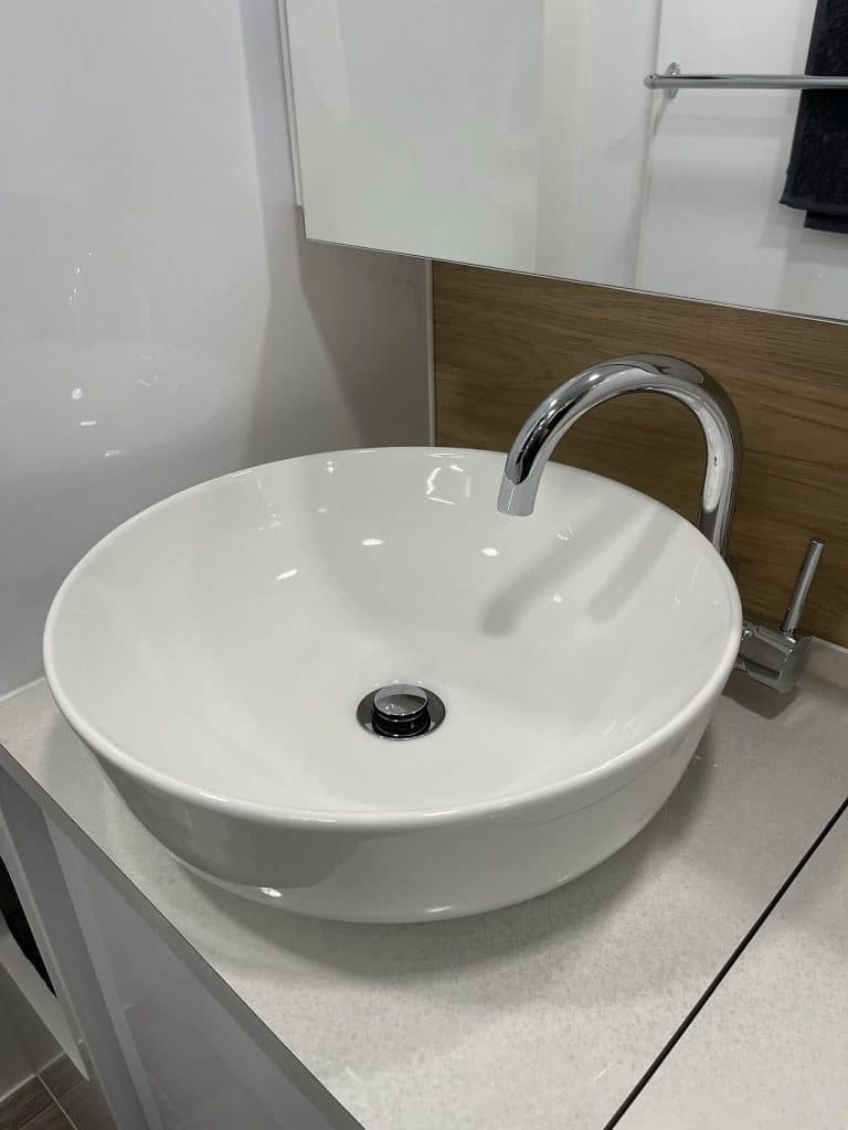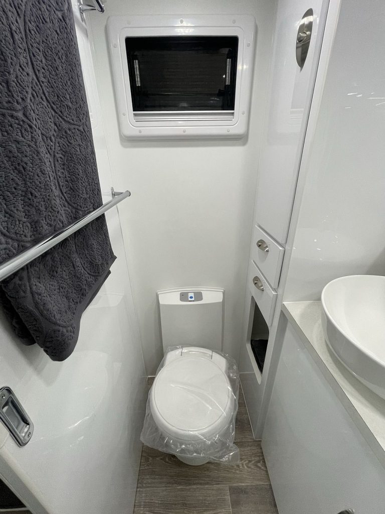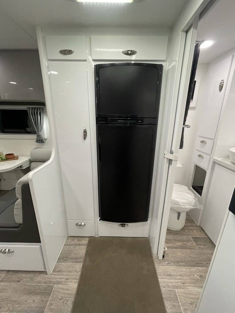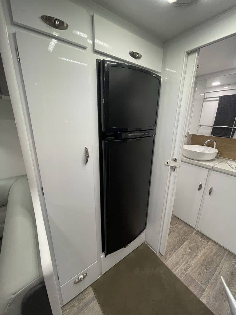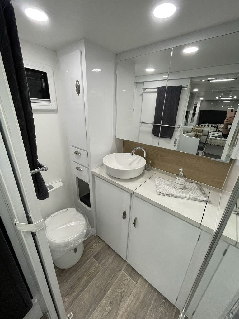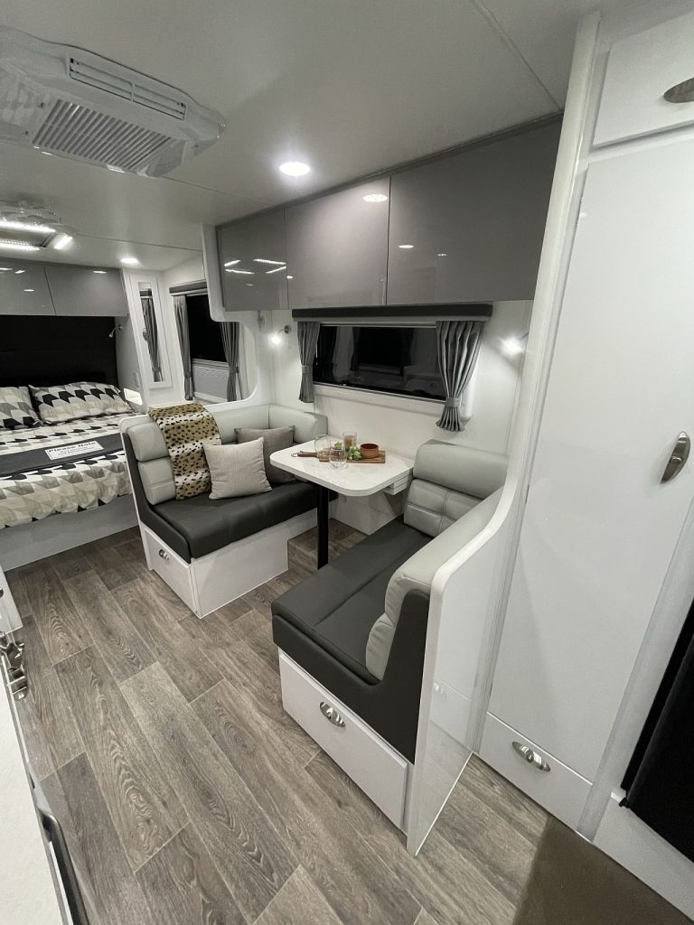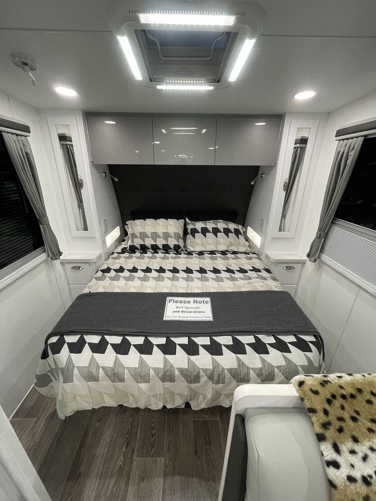 The bedroom has a full queen lift up bed with loads of storage. The robes either side provide hanging, while the Overhead cupboards give plenty of space for all of your other needs. The clever little port holes next to the robes give storage for CPAP machine, glasses or to simply charger the phones.