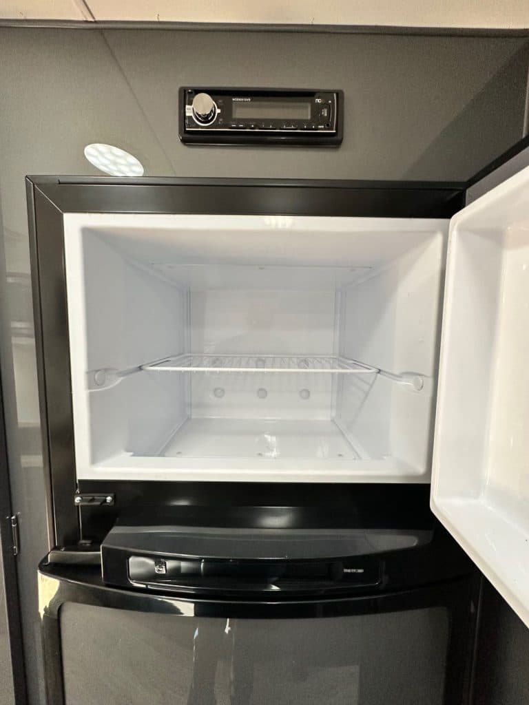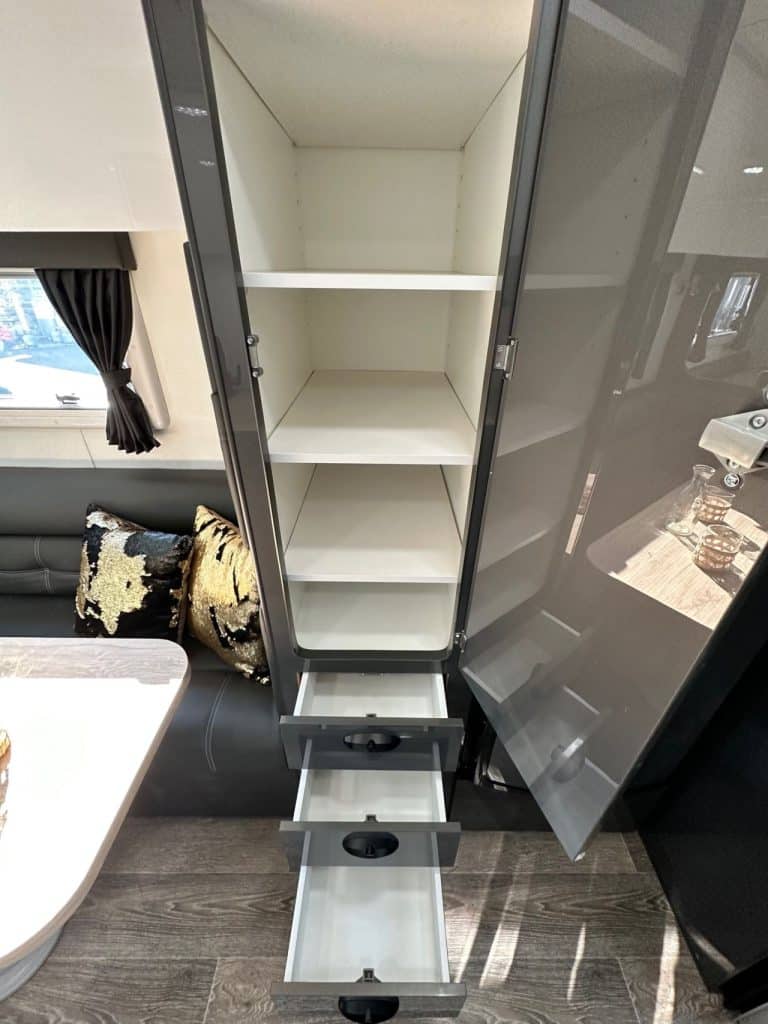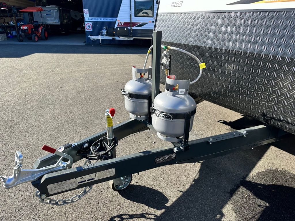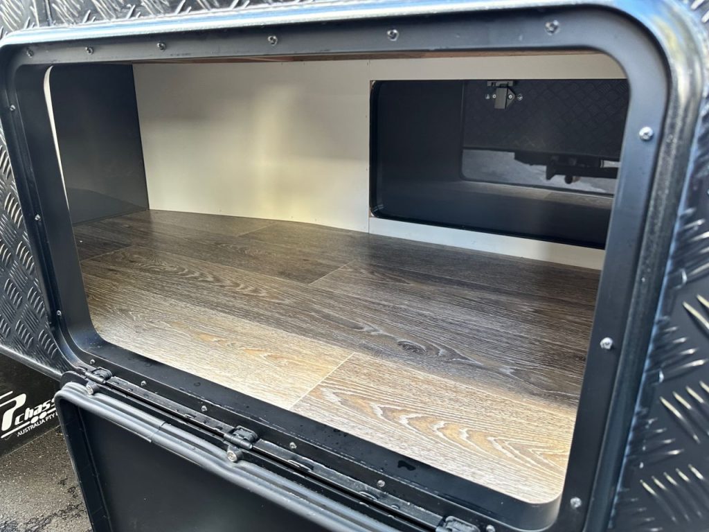 Walking around the external of the caravan storage is on point. On the off side of the caravan you have 2 large access doors to access the tunnel boot and the other to access under bed storage. An extended a frame that’s ready to have a toolbox fitted if required to suit your travelling needs and also features provision for a GripSport bike rack. Under the awning you will find a lined entertainment locker ready to fit the Tv for outdoor entertainment. An external locker under the bunks gives you additional storage. The caravan is sitting on 16” Alloy rims and all terrain tyres. 3.5 Tonne roller rocker suspension. You will find a 110ltr grey water tank, 2 x 95ltr water tanks, 100 amp hour battery and a 200watt solar panel all conveniently ran through a PM300 Projector system.