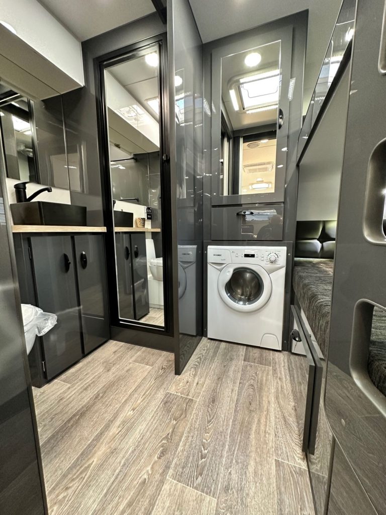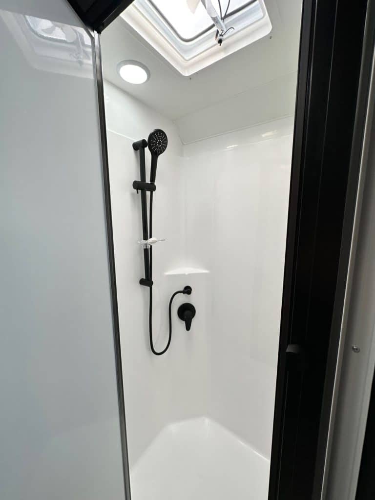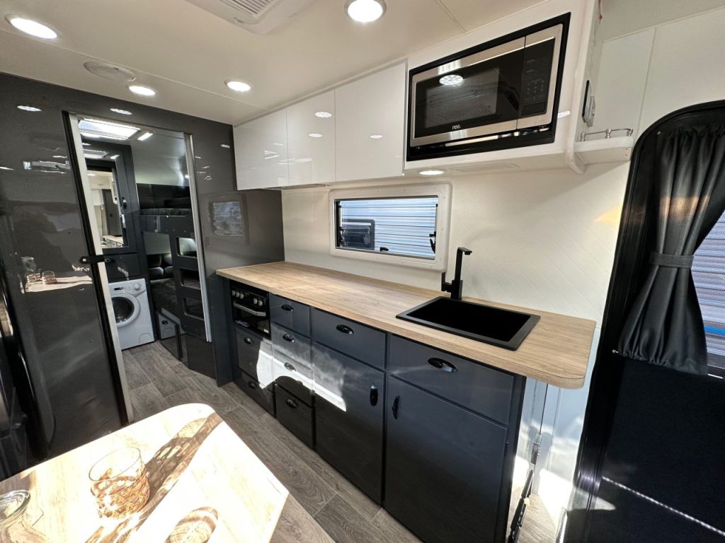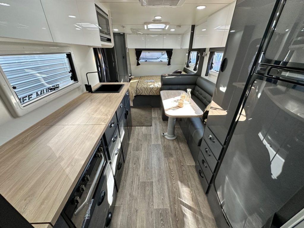 Walking into this family model your greeted with a Queen size east west bed tucked into the front of the caravan with a full height robe and port hole for storing items close to your bed. The overhead cupboards wrap around the front of the caravan maximising storage space. As you walk down the caravan you have an L-shape lounge that has an adjustable table leg for converting into an additional bed space as well as the convenience for tucking the table closer for little ones eating. A pantry with 4 adjustable shelves and 3 small drawers is found tucked next to the 199ltr 3 way fridge. The kitchen is styled with a black granite sink and has a 3 burner gas and 1 electric cooktop with mini griller below. Walking through into the bunk area that is divided with a Concertina door is twin 6’2 bunks with storage below the bottom bunk. With a convenient built in cut away ladder for easy access. Each bunk has a Sirocco fan for all night comfort. Dividing the ensuite and bunk area is a large robe with front load 4kg washing machine. Walking into the ensuite with the large opening Concertina door you have a Porcelain toilet and vanity. Full size shower tucked behind a mirrored door.