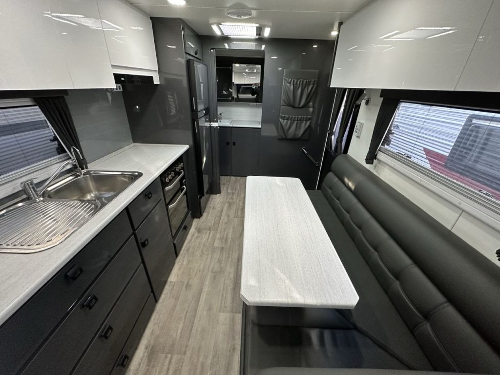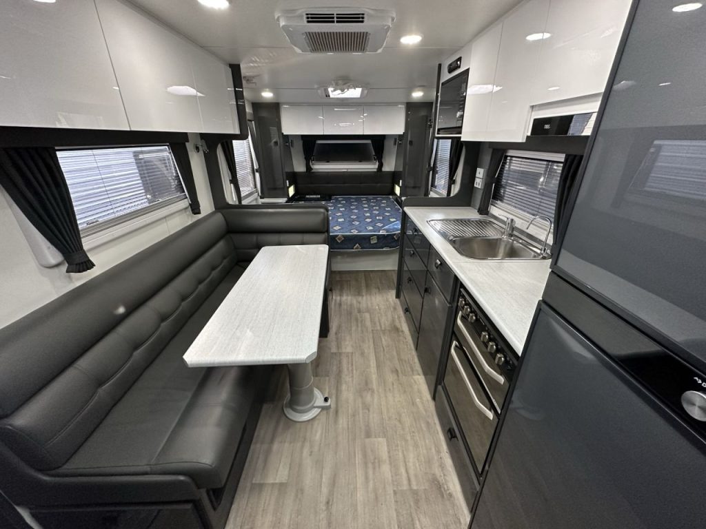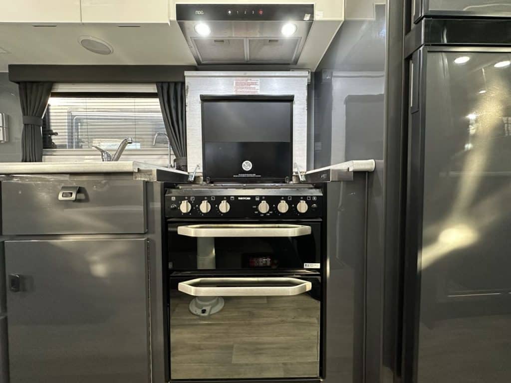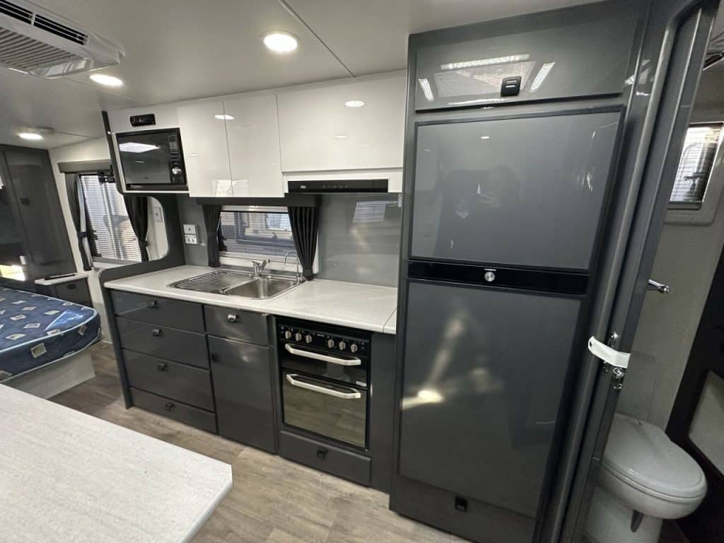 As you step into this rear door caravan to your right you have a full-size ensuite with a porcelain toilet, shower, basin, and a top load 2.5kg washing machine under a lift-up benchtop to provide you with plenty of bench space. Walking through to the centre of the caravan you have a large L-shape lounge with an adjustable table leg to convert to an additional sleeping space. Opposite you have your kitchen with a large two-door 184L 3-way fridge, microwave, range hood, full oven, grill, and cooktop. Found under the bench is a convenient pull-out pantry to store pantry items.