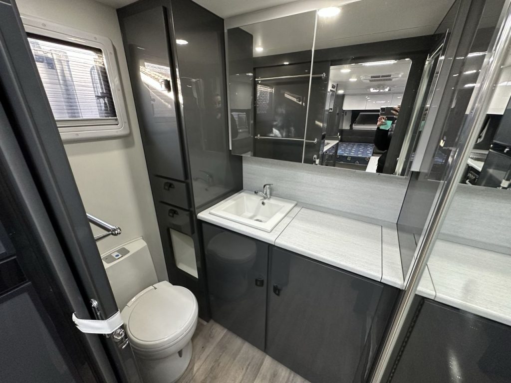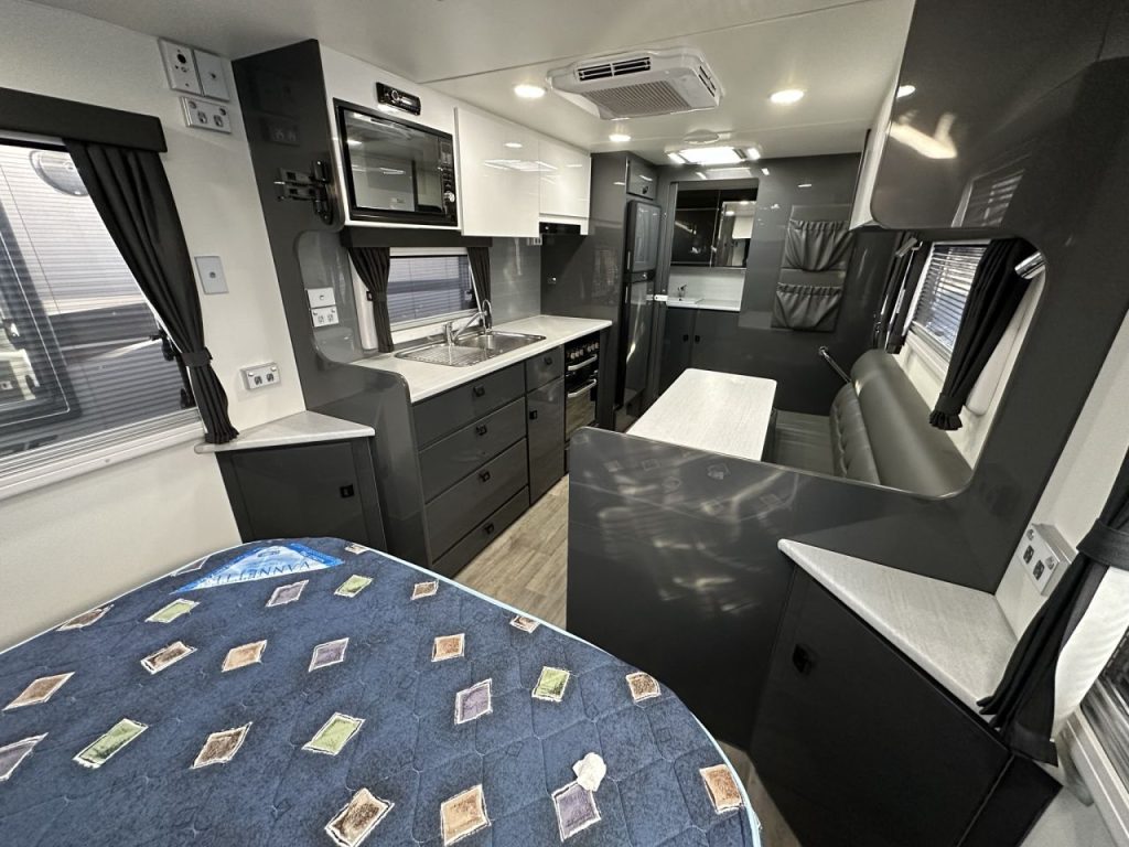 Walking through to the front of the caravan you have an island queen lift-up bed with robes on either side and overhead cupboards. Each robe has a convenient port hole with power and lighting to store items while you sleep. The bedroom has large windows with built-in blinds and flyscreen and a Ranger hatch over the bed creating plenty of natural light. A Sirocco fan is installed over the bed to give you all-night comfort in conjunction with the rooftop reverse cycle air conditioner.