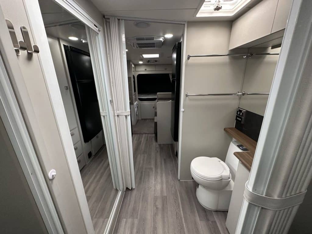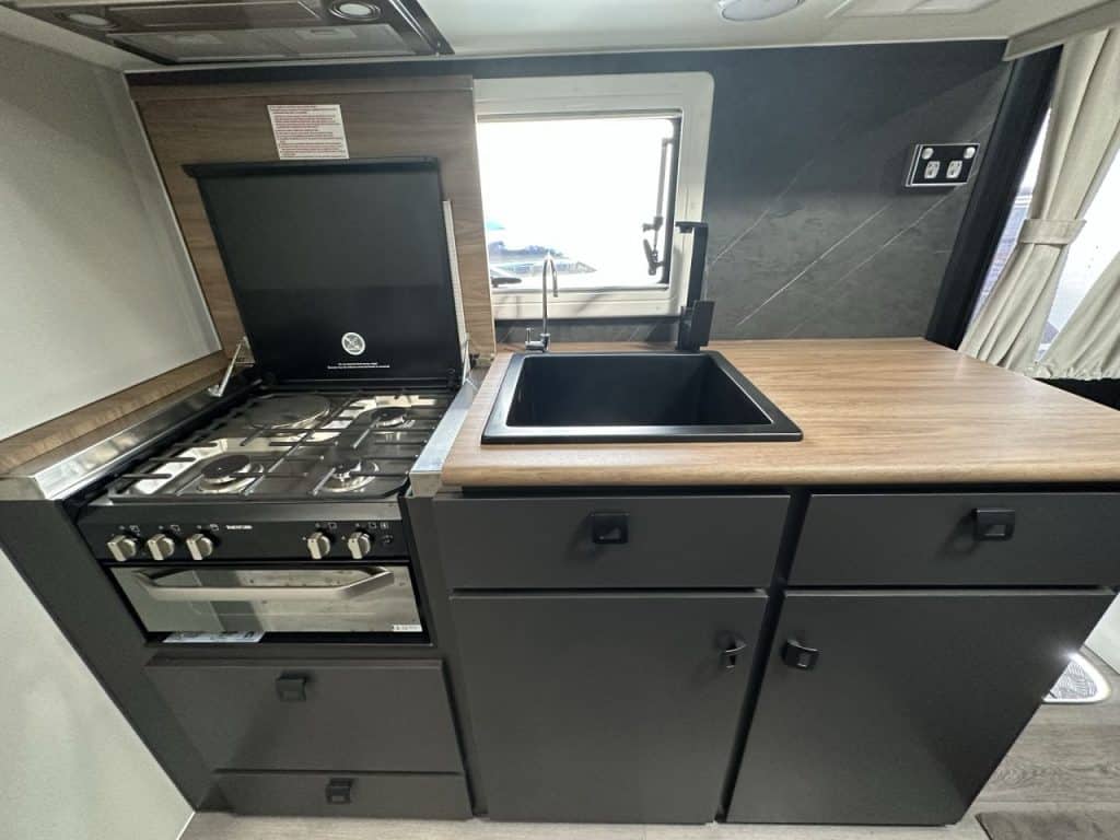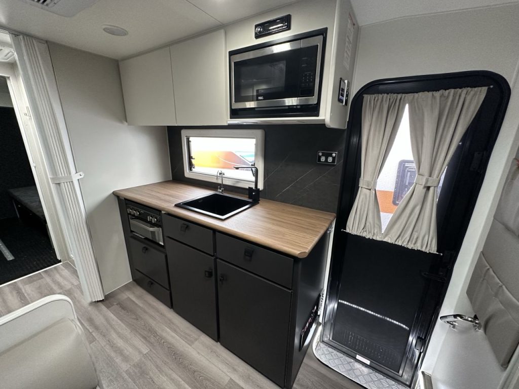 Externally the caravan sits on a 6” chassis with 4.4-tonne airbag suspension with twin shockers and a wireless controller. !2” Brakes and 16-inch rims and a DO45 coupling completes the overall towing experience.