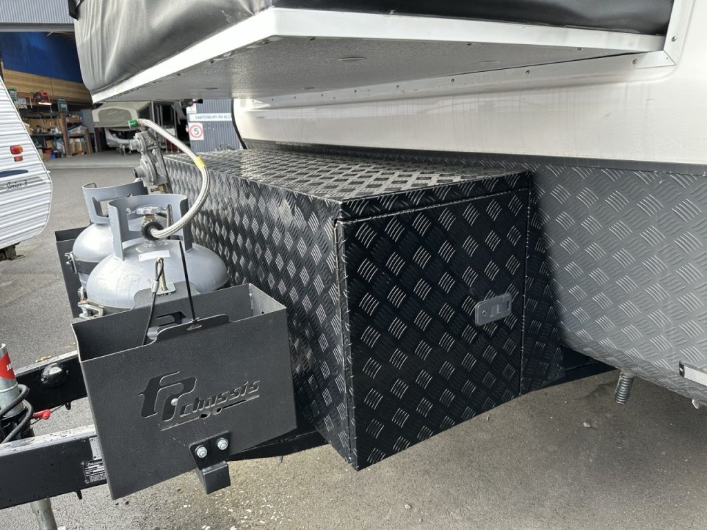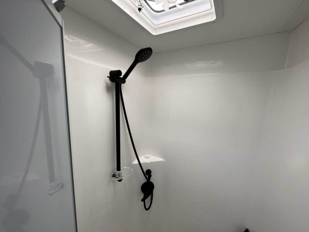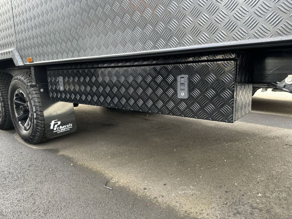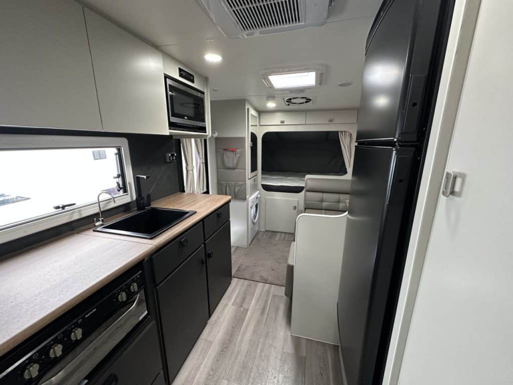 The caravan boasts a 100L grey water tank, twin 95L water tanks, a 200AH lithium battery with 4×200 watt solar panels, 25AMP DC:DC charger, and an Enerdrive 2600 watt inverter all ran through a Projecta PM300 Bluetooth with shunt charge system.