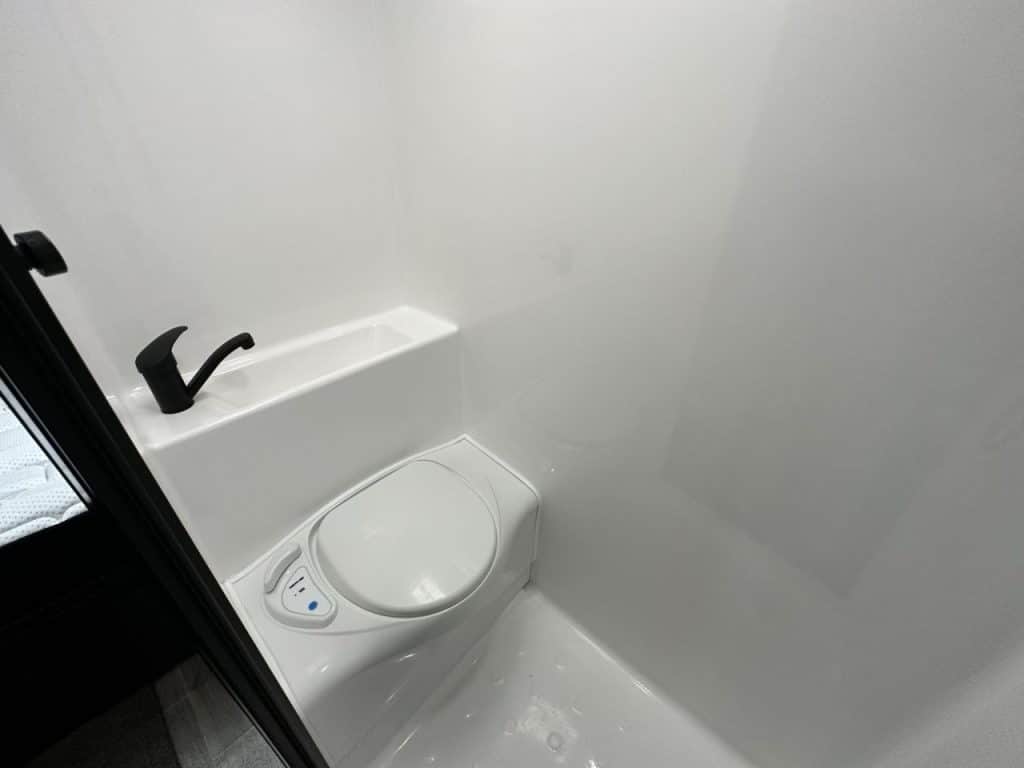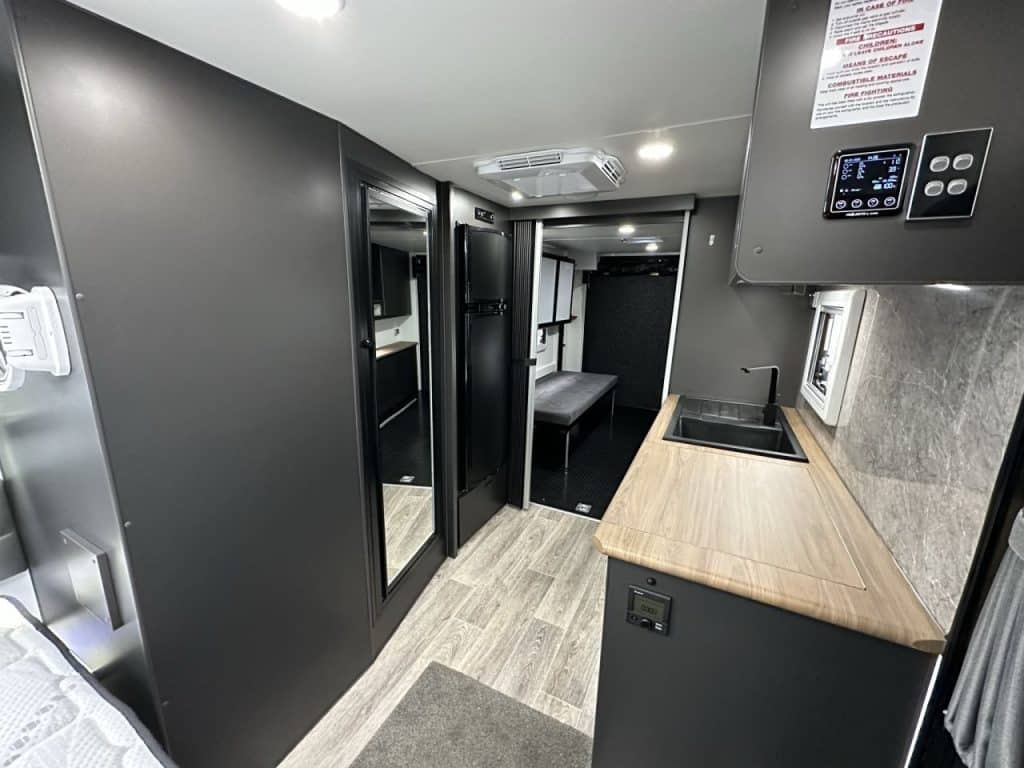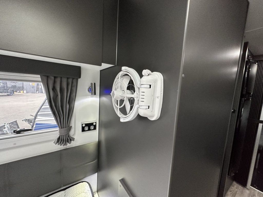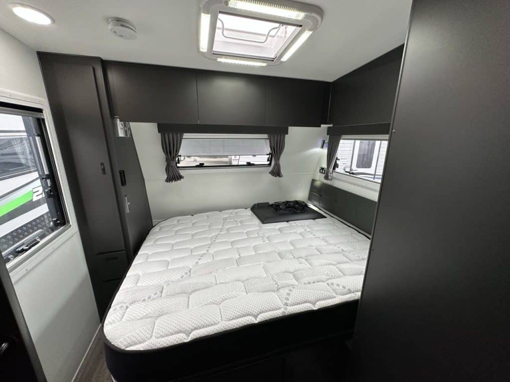 Stepping into this layout to the left you have a large queen east west bed measuring 6’2” x 5”. The bedroom has a wardrobe with wrap around overhead cupboards. A sirocco fan and 32” smart Tv is mounted in the bedroom.