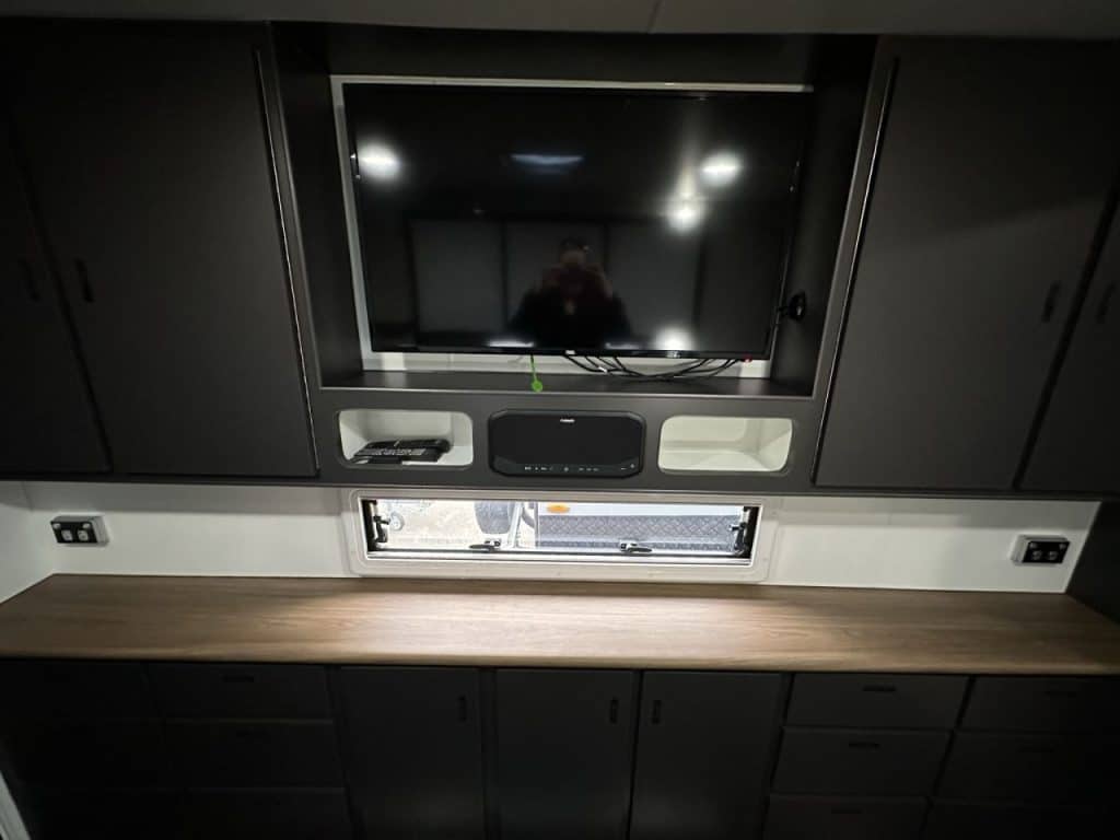 Going through to the garage of the caravan it has 2-fold up bunks, and a large entertainment unit with an abundance of storage cupboards and a 40” smart TV and fusion panel stereo. This garage has been custom built to fit motor bikes or larger toys of lengths up to 2500mm.