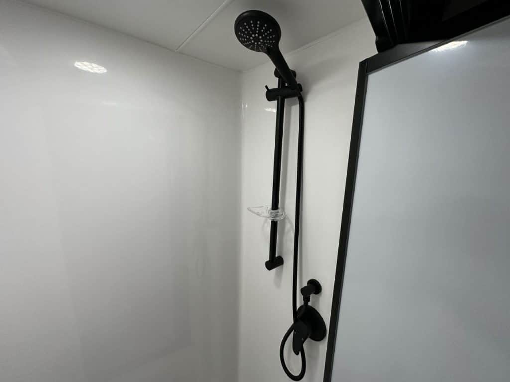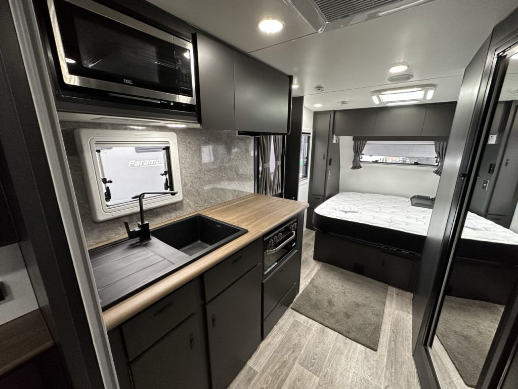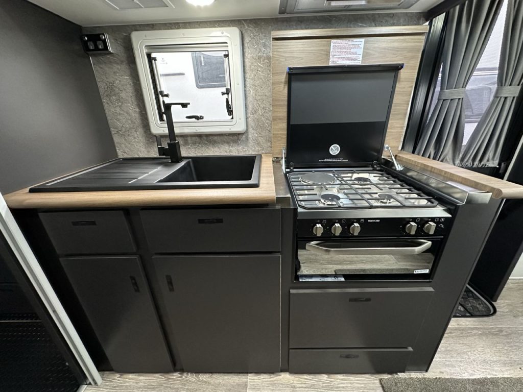 Walking through to the centre of the caravan. The offside has a combination shower and toilet with black tap wear. The kitchen has a 199L 3-way fridge, four burner stove and mini grill, range hood, microwave and a black granite kitchen sink. All drawers are fitted with soft closing drawer runners.