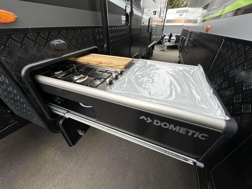The front of the caravan has a DO45 with upgraded chains so the payload is in excess of 1000KG. Stone shield, twin 9kg gas bottles and a large front tool box. The caravan has additional storage with the front tunnel boot that hosts a Dometic slide out kitchen. Under the large awning you will find a small marine lined TV entertainment locker, external speakers and picnic table. Perfect for those balmy nights cooking and enjoying the great outdoors.
