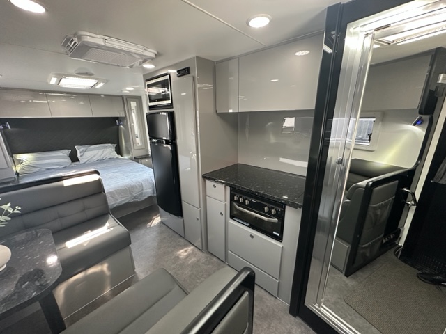 Opposite the seating is a recessed mini grill with three gas burners and one electric burner. Located above the grill is a 12V range hood and cupboard with all your electrical components in one handy location. The fridge is a 166L 3-way with freezer. Above is a 25L microwave, next to the fridge is a full height pull out pantry with five large metal baskets that are adjustable in height.