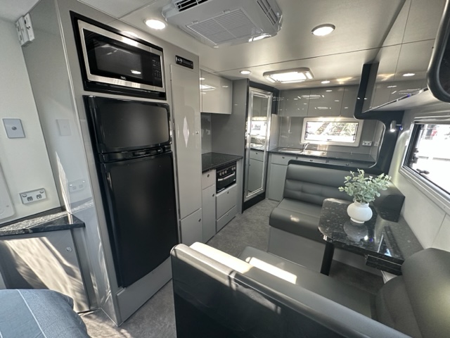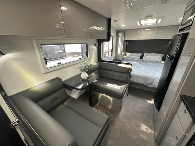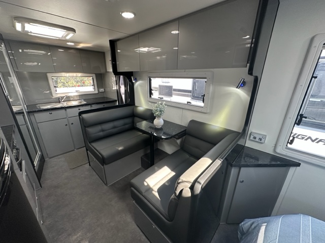 The café seating is optioned with a tri-fold table and three large overhead cupboards. Conveniently fitted under the table is 240V and 12V points for charging the phones or laptop.