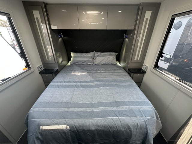 A queen lift up island bed finishes the internal features of this compact caravan. With robes either side for clothing and small drawers below, there’s ample space for comfortable traveling.