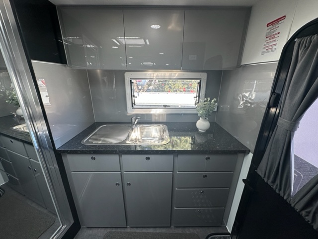 The shower and toilet are in the back corner of the caravan. This is finished in a 1-piece fibreglass shell with a built-in sink. This area has been oversized to create plenty of space although this is a combination shower and toilet. The entry to the shower is finished with a chrome door and full height mirror. A 28L gas and electric hot water system will provide a comfortable shower on demand.
