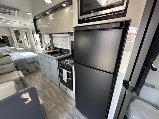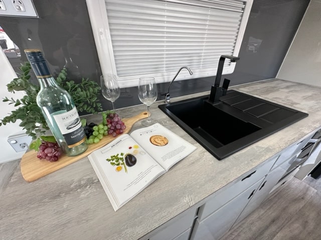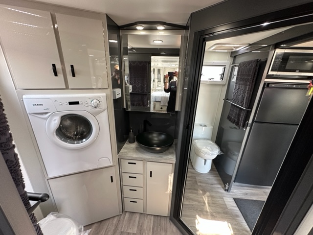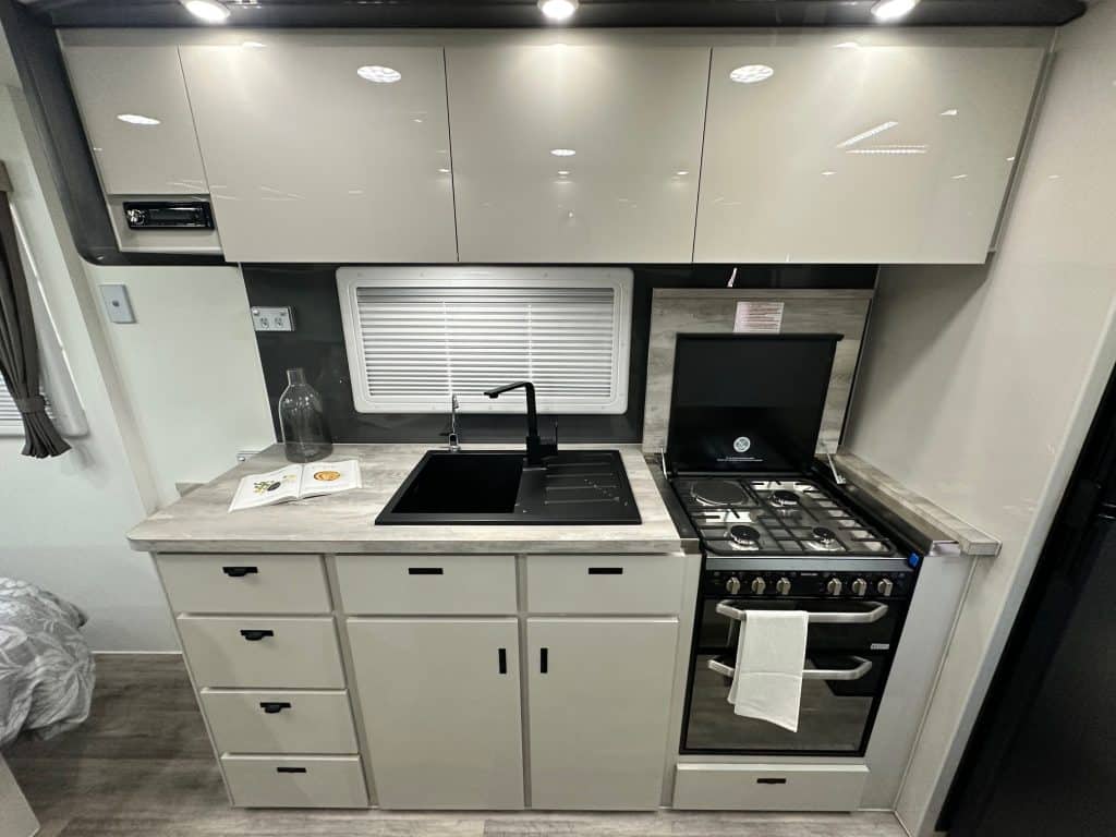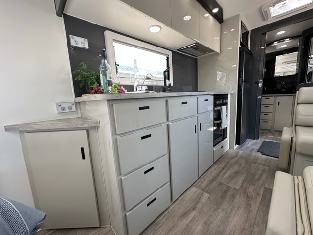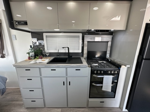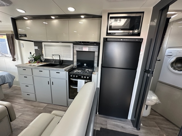 Walking through to the centre of the caravan you have a large kitchen with 274L compressor fridge, a full oven complete with grill, and 4 burner cooktop. Microwave, rangehood a great use of cupboard space all finished in our very sleek looking CNC furniture with flush mount and concealed latches.