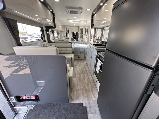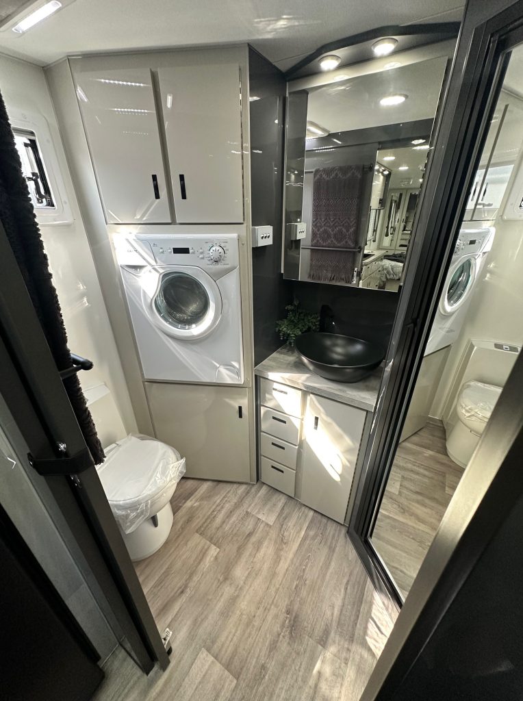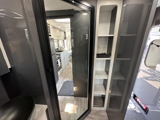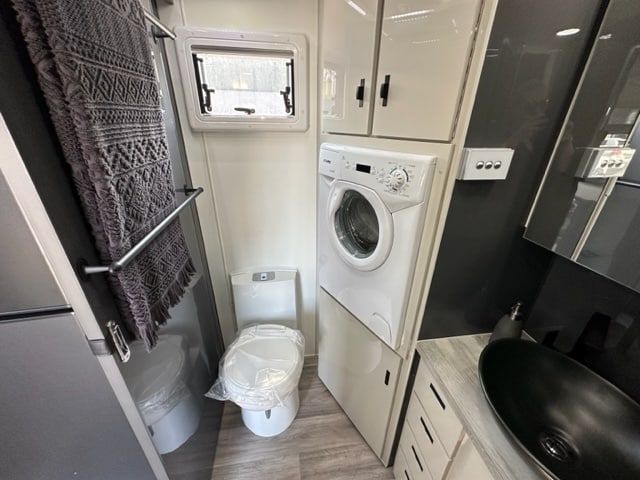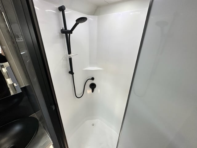 As you step into this 23’6 Studio rear door layout to the right you are greeted with a grand ensuite. With front-load washing machine, ceramic toilet, and large shower space.