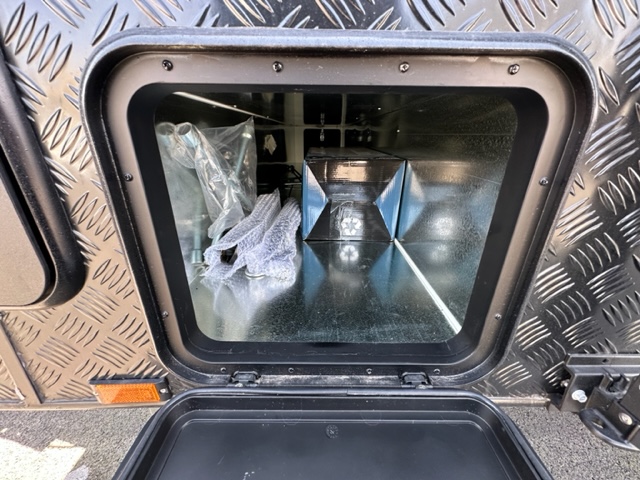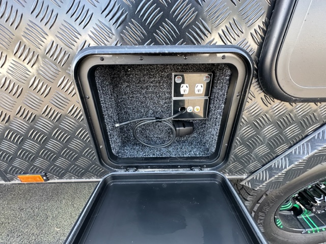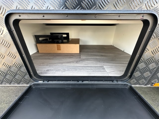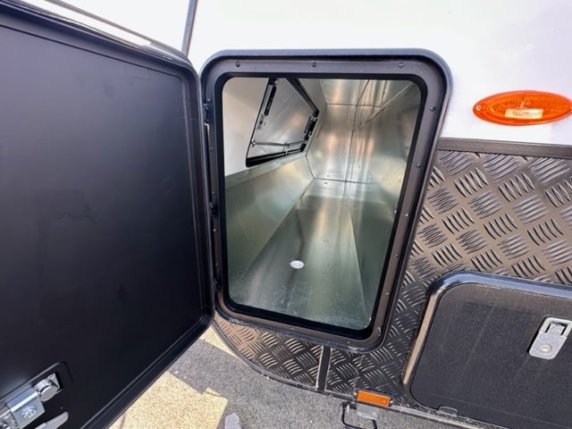 Looking at the exterior of the caravan it’s sitting on a 6” chassis and 6” A-frame with a leaf spring suspension, 16” MPC trooper wheel, and all-terrain tyres. The caravan is finished in white composite and 1-piece roof and black checker plate. Storage is no issue with a tunnel boot in the front that can be accessed by two locker doors and a front boot door. An additional locker door for easy access for under-bed storage.