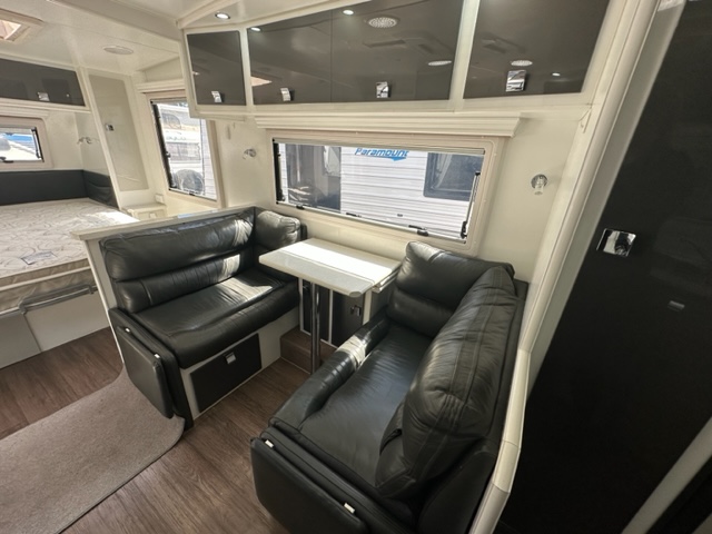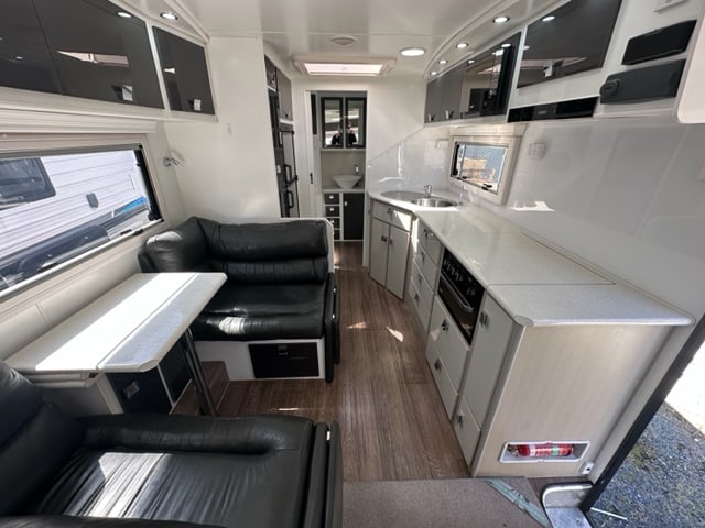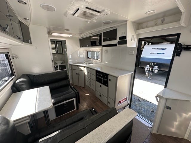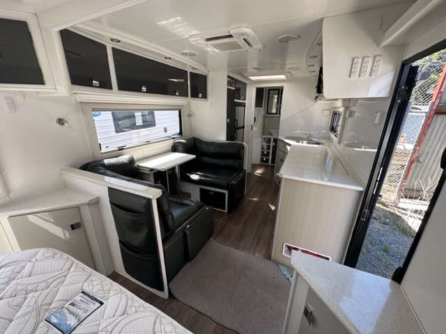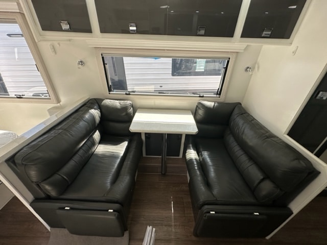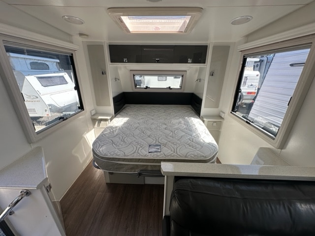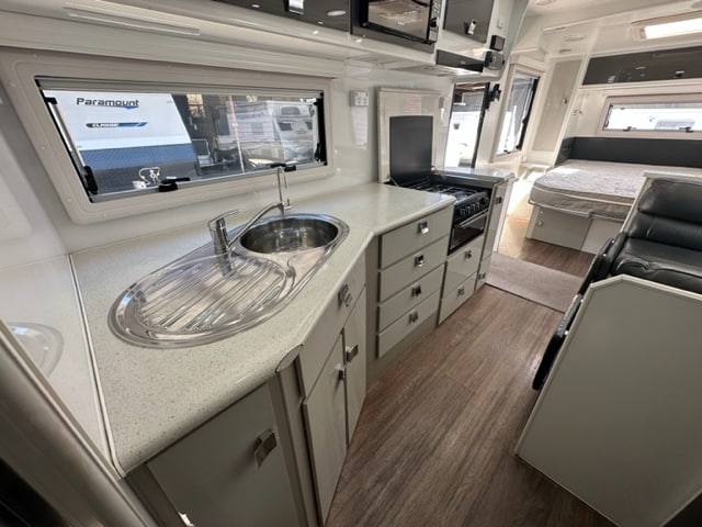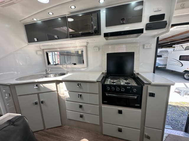 All the luxury comforts of home while you’re on the road. Stepping into this layout to the front you have a queen lift-up bed with storage below. Two great-sized robes with overhead cupboards for clothing storage. Stepping through to the centre of the caravan you have a café lounge with lush padding complete with footrests and a trifold table to push back or bring out when needed. The kitchen opposite has a great-sized bench. The kitchen hosts a 4-burner cooktop, grill, rangehood, microwave, and large sink. The sink has a flick mixer and a separate water filter tap. Below the bench, you have a pull-out pantry perfect for condiments and spices. The caravan has a large two-door 3-way fridge with a full-height pull-out pantry. Storage is very prominent in this design!