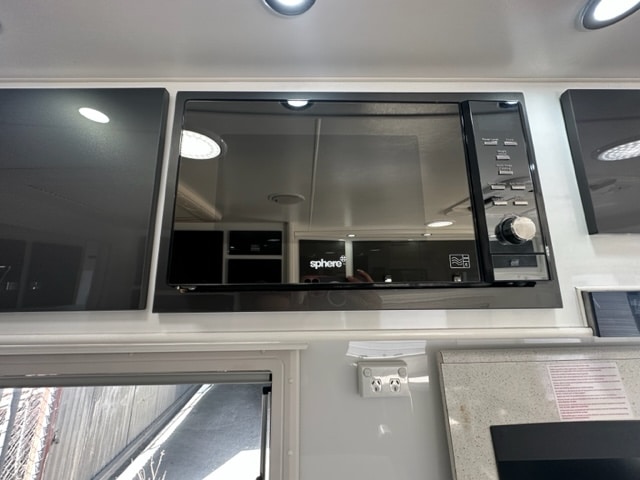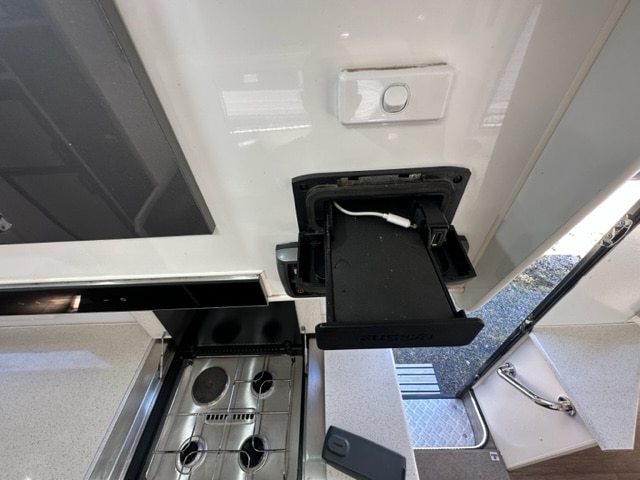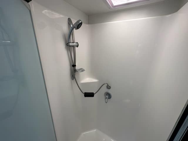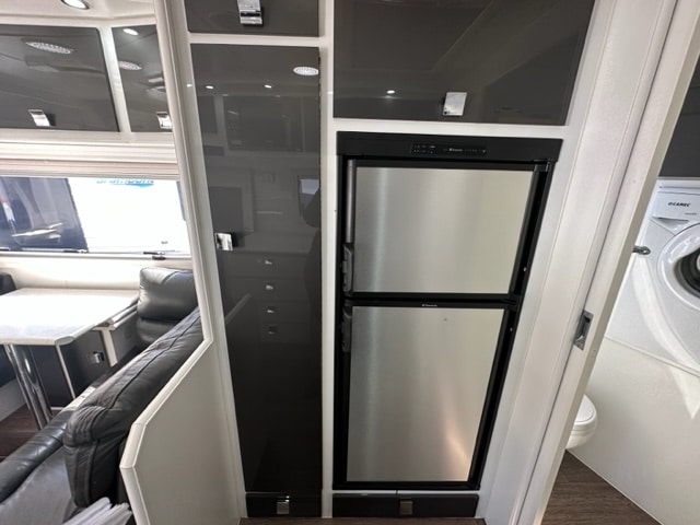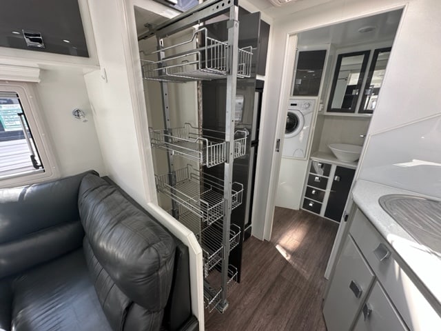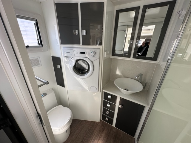 Stepping through to the rear you are stunned with a full ensuite with 4kg front load washing machine and linen space above. Thetford swivel toilet, stylish surface mount basin, and full-size shower.