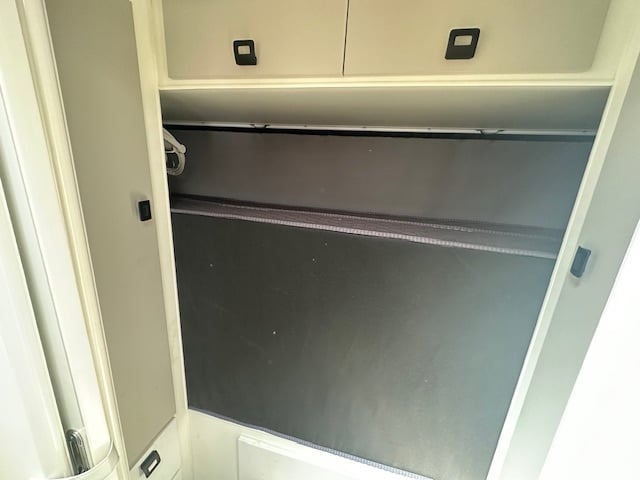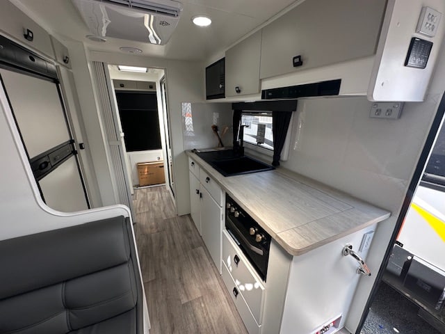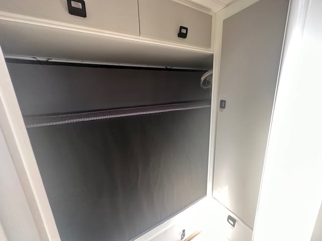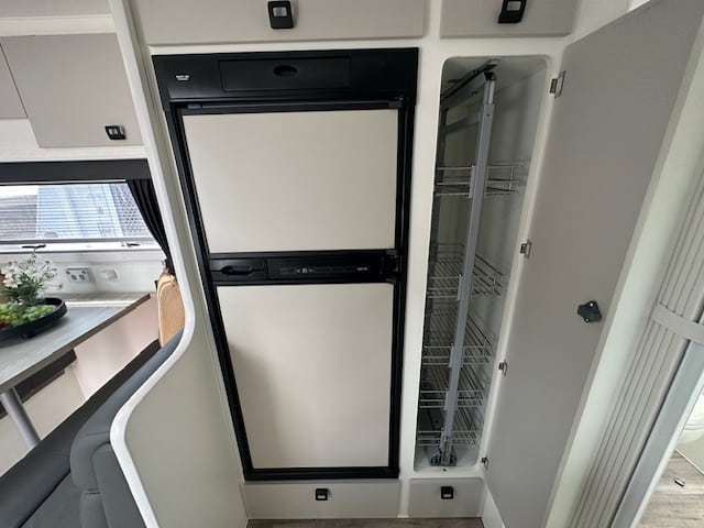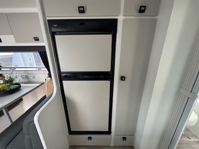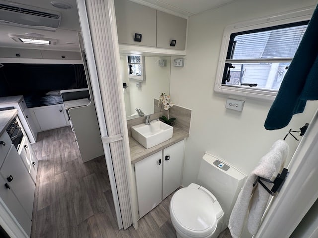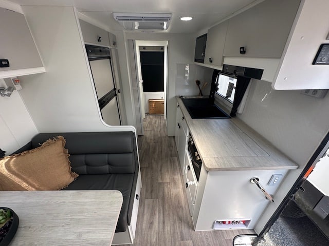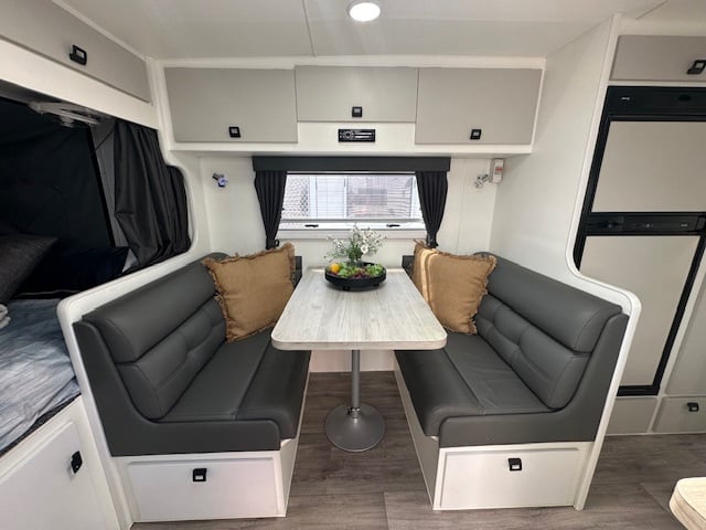 Walking into this front door layout you are immediately greeted with a café lounge. Turning to the left you have a duet queen bed end with two Sirocco fans a reading lamp and 240V/12V points. Walking through to the centre of the caravan the kitchen is on both sides. The awning side of the caravan has a four-burner cooktop and mini grill, a large black granite sink. Opposite you have a full-size pull-out pantry with a Thetford 3-way 2-door 182L fridge. Stepping down the rear of the caravan you have a full-size ensuite with shower toilet and vanity. Dividing the kitchen from the ensuite is a concertina door and dividing the additional bedroom and robes down the rear is a cavity sliding door.