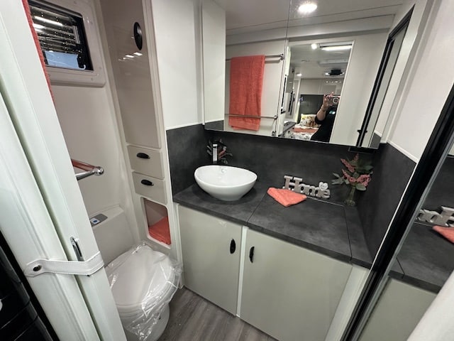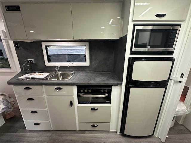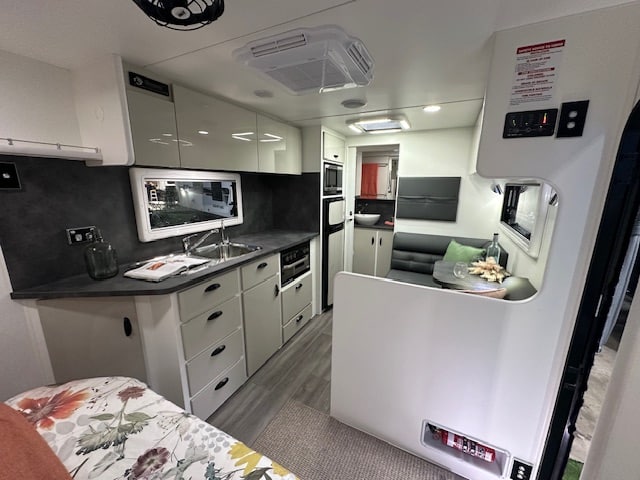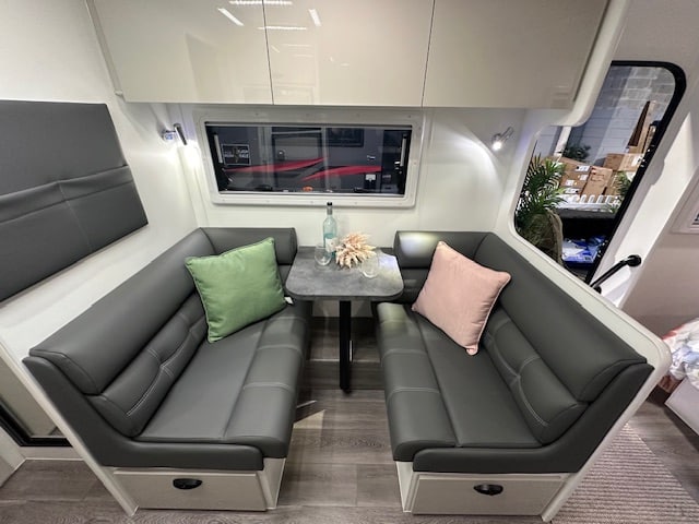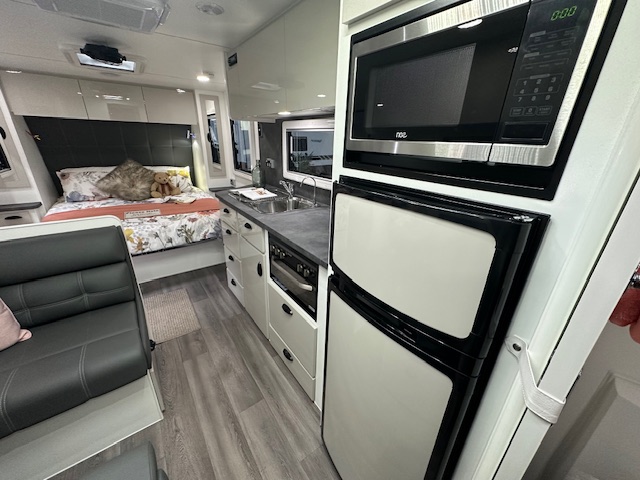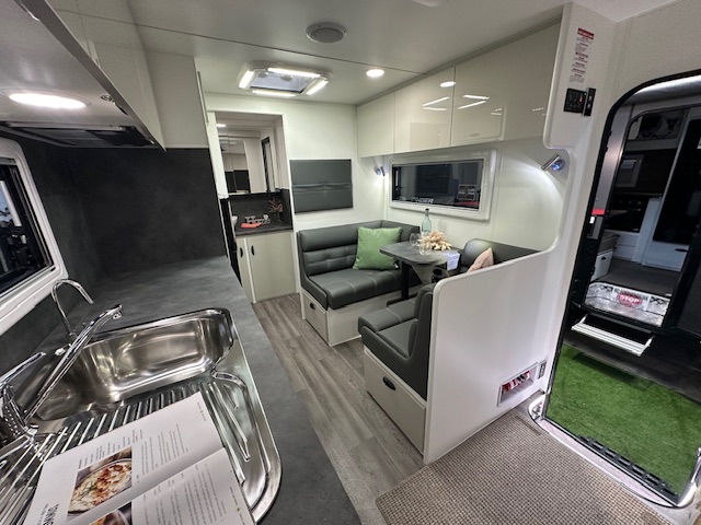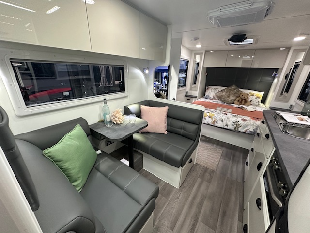 Walking into this front door layout to the left you have the bedroom. Complete with a lift-up queen-size innerspring mattress, twin robes, and overhead cupboards. Walking through to the centre of the caravan you will find your kitchen and café seating. The kitchen has an 184L 3-way fridge, rangehood, microwave, and 4 burner cooktop with mini grill. The large sink has a flick mixer and a separate water-filtered tap.