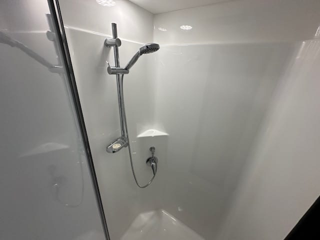 Walking through to the rear of the caravan you have a full-size ensuite. With a spacious shower, top-load washing machine, and porcelain toilet.